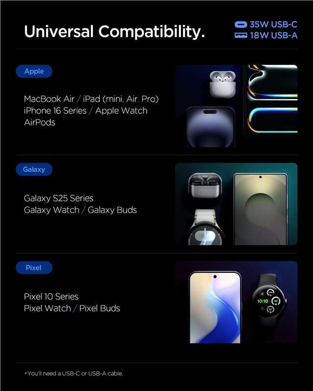 Využívá inteligentní systém distribuce energie Smart Power Distribution pro optimální rozdělení výkonu mezi připojené přístroje. Odolný materiál v kombinaci s moderními čipy zajišťuje vysokou životnost a minimální zahřívání i při plném zatížení obou portů.
