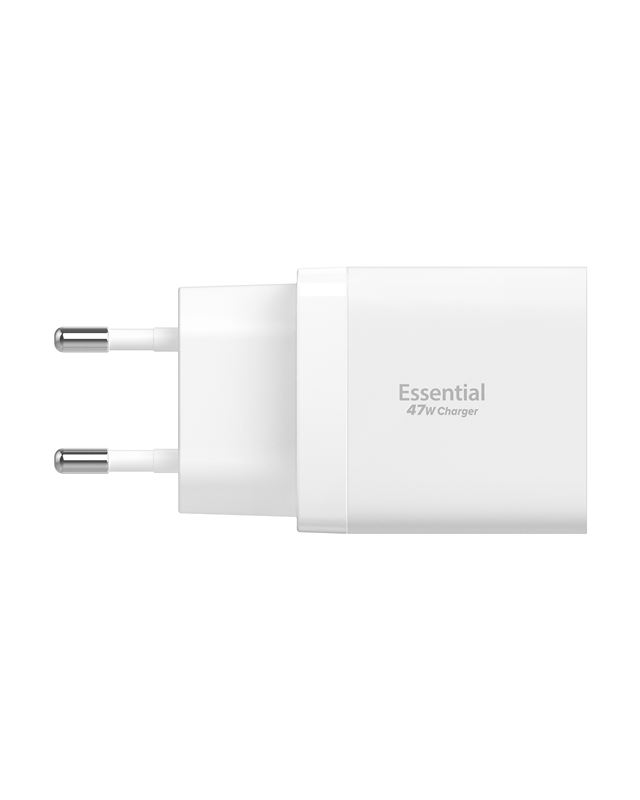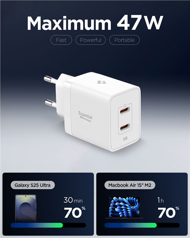 Bílá síťová nabíječka vybavená dvojicí USB-C konektorů umožňuje efektivní doplňování energie s celkovým výkonem 47 W. Integrovaný bezpečnostní standard chrání elektroniku před nebezpečím přehřátí a přebití, zatímco funkce Quantum Boost zkracuje dobu potřebnou k dosažení plné kapacity baterie.