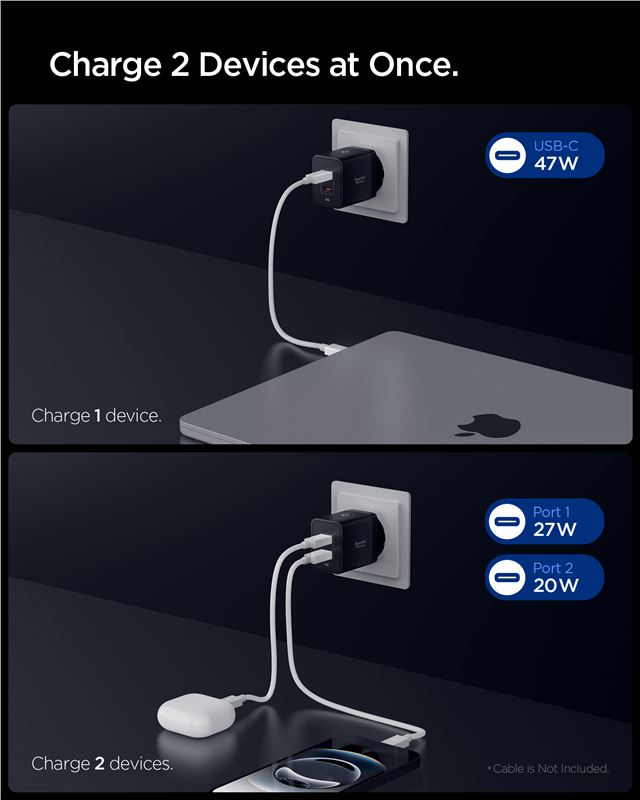 Rozděluje výkon mezi výstupy v poměru 27 W a 20 W, čímž vytváří ideální podmínky pro nabíjení telefonu i tabletu najednou. Kompaktní konstrukce z pevného polykarbonátu zaručuje dlouhou životnost a snadnou manipulaci při každodenním používání v domácnosti i kanceláři.