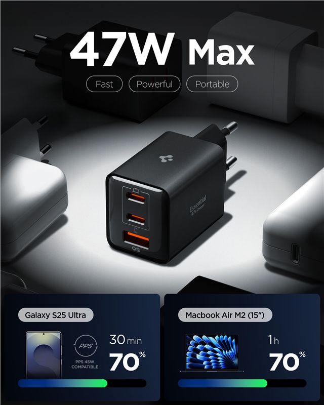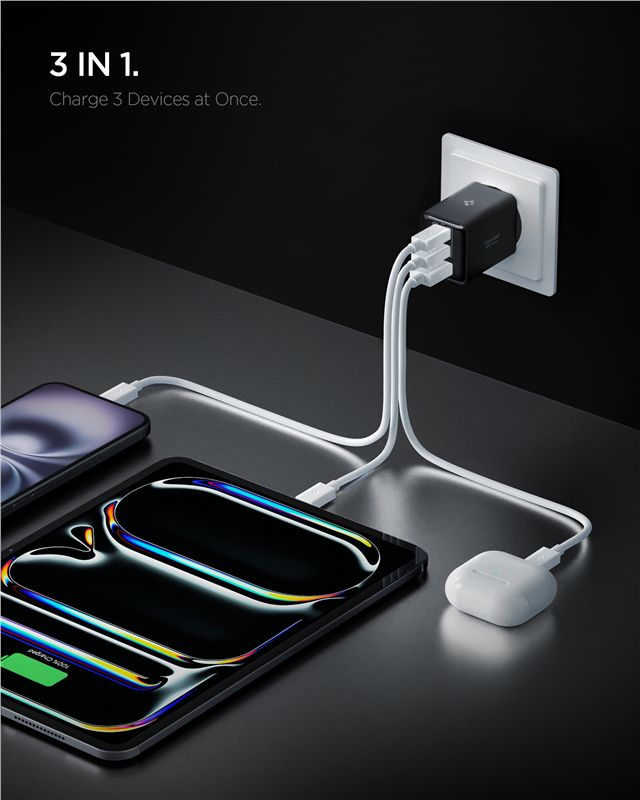 Výkonná síťová nabíječka s celkovým výkonem 47 W umožňuje doplňovat energii až třem zařízením současně. Šetří místo v zásuvce i čas při nabíjení kombinace chytrého telefonu, tabletu a dalšího příslušenství skrze porty USB-C a USB-A.