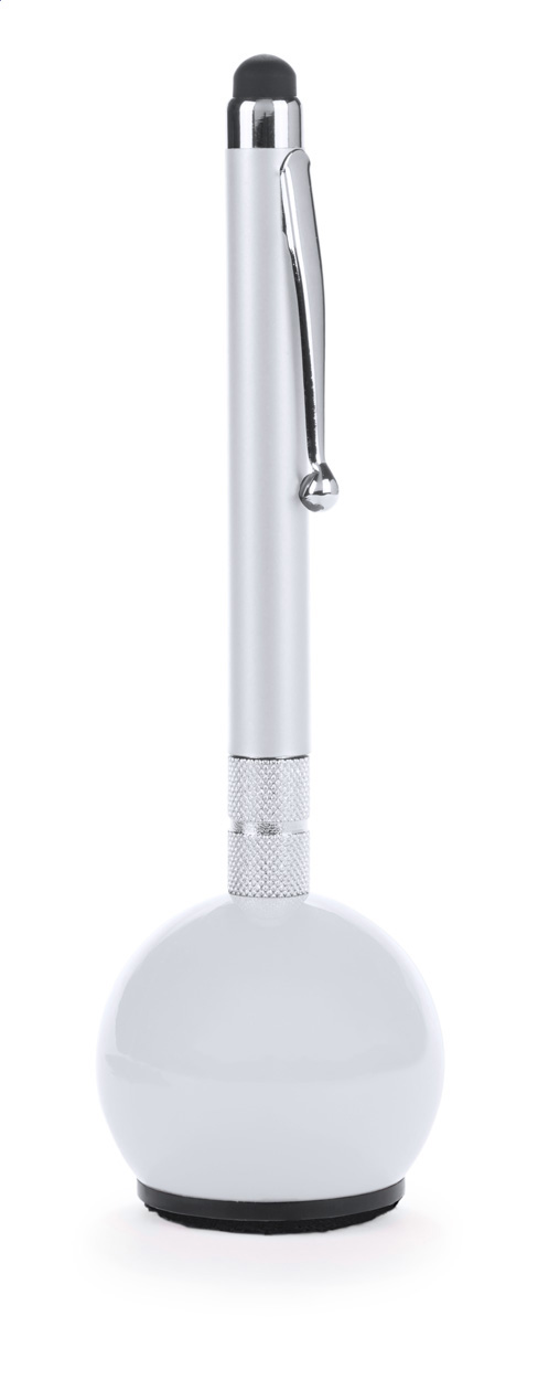Plastové kuličkové a dotykové pero se stojánkem, na spodku je čistítko z mikrovlákna na obrazovky. Modrá náplň.