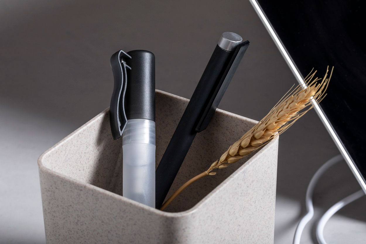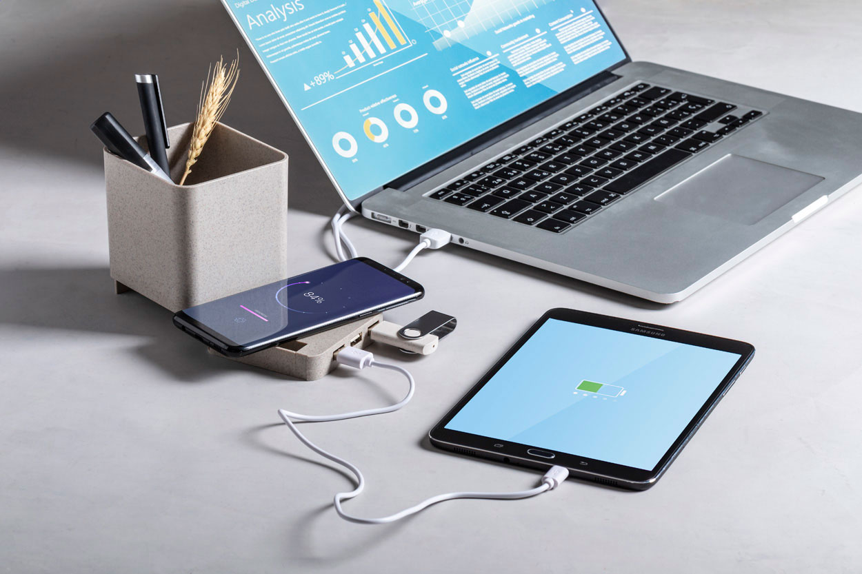 Multifunkční stojánek na pera vyrobený z plastu a pšeničné slámy s držákem na mobilní telefon, bezdrátovou nabíječkou (max. výstup 1000 mA) a USB rozbočovačem se 3 porty (USB 2.0). Včetně USB kabelu.