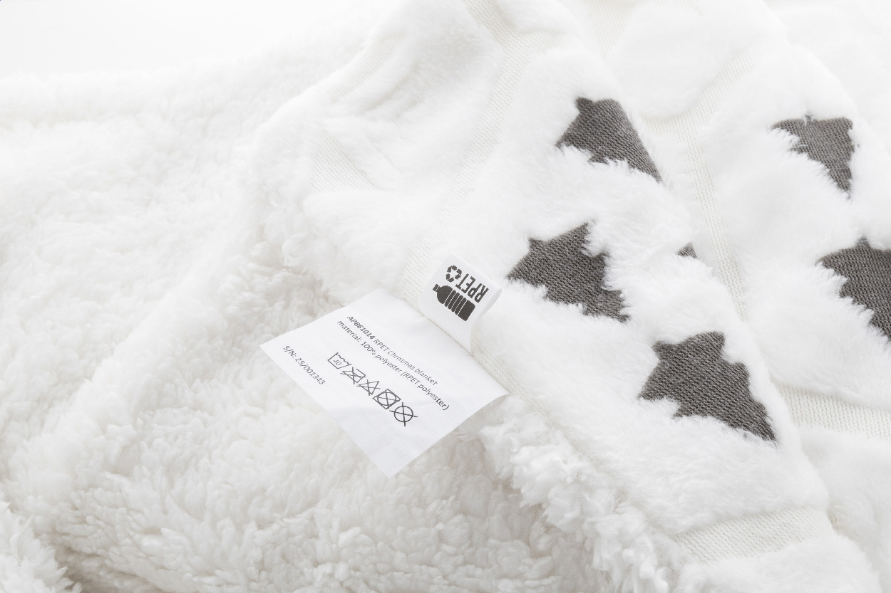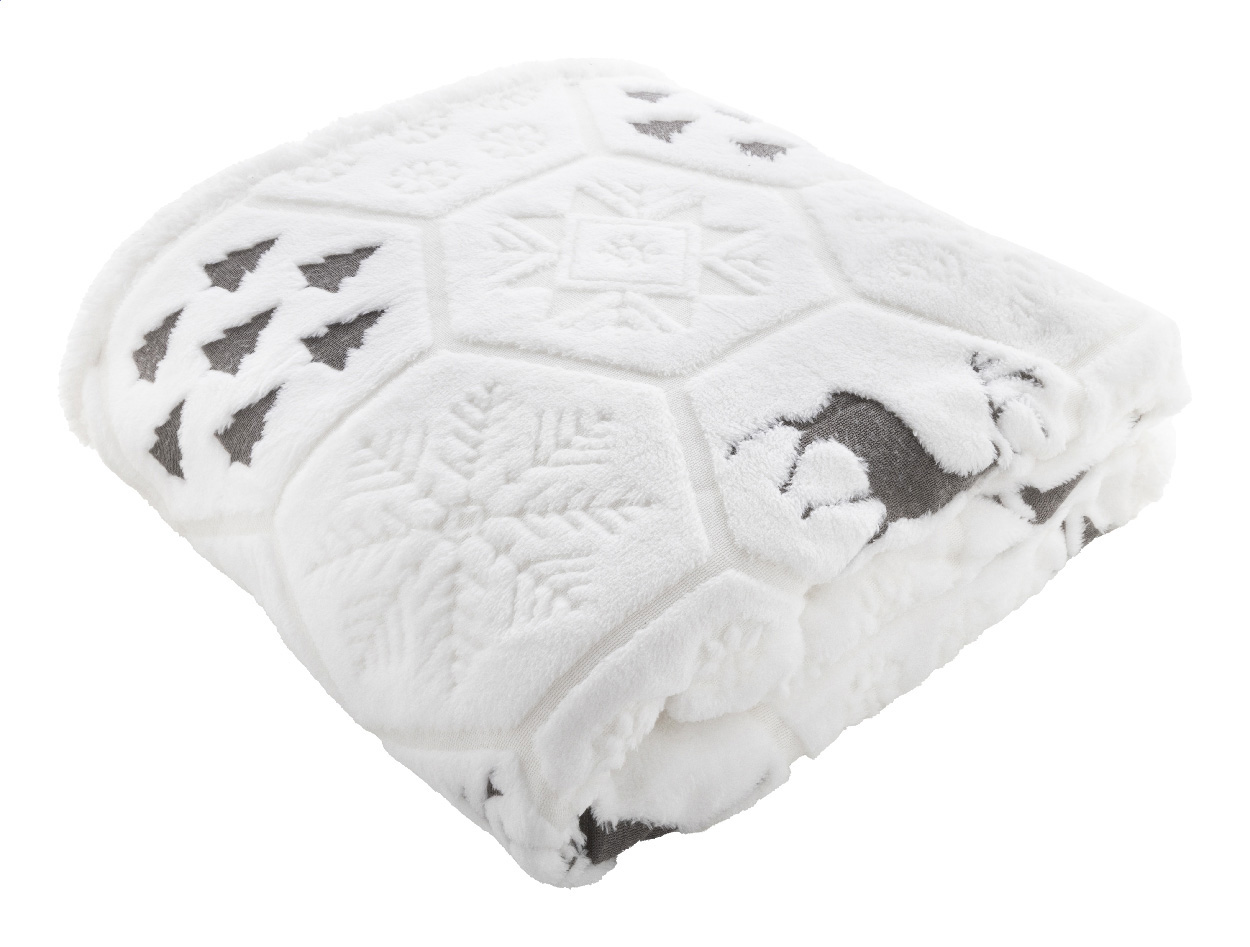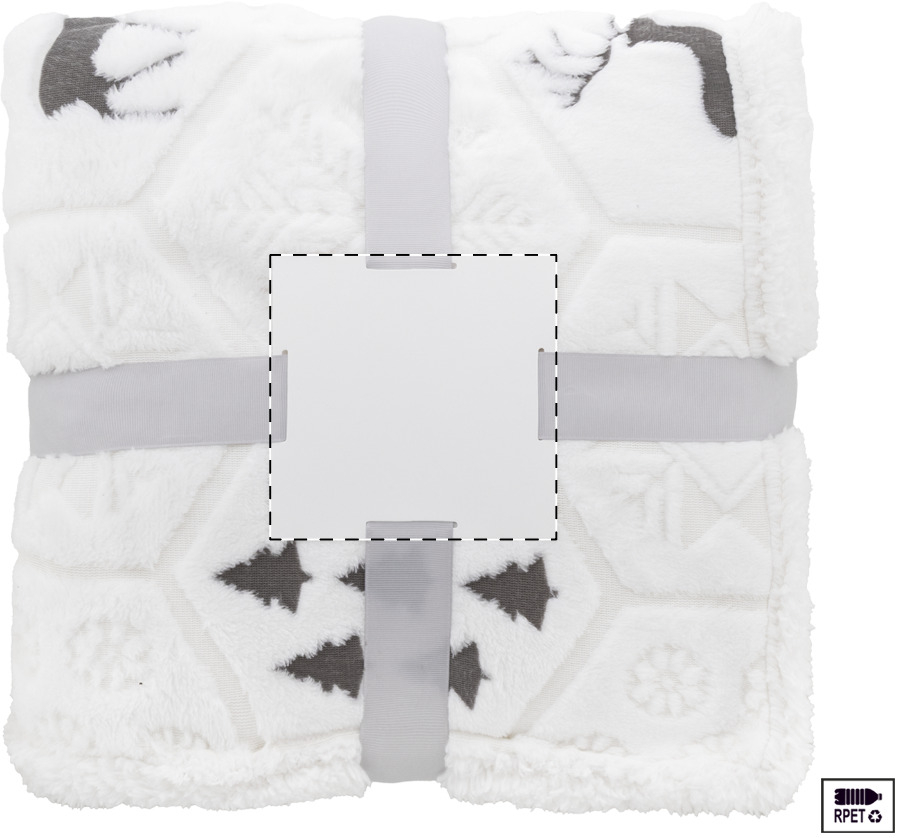 Luxusní dvouvrstvá vánoční deka z RPET s reliéfním zimním vzorem. S flanelovým fleecovým materiálem RPET 270 g/m² a oboustrannou podšívkou z RPET sherpa fleecu 210 g/m². Zabaleno do stuhy a tisknutelného papírového kartonu.