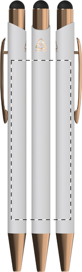 Bílé kuličkové pero Auros elegantně spojuje klasickou psací potřebu s dotykovým stylusem pro ovládání chytrých zařízení. Tělo z recyklovaného hliníku s pogumovaným povrchem příjemně sedí v ruce a neklouže při psaní. Luxusní vzhled dotvářejí detaily v odstínu růžového zlata, které zvýrazňují moderní design.