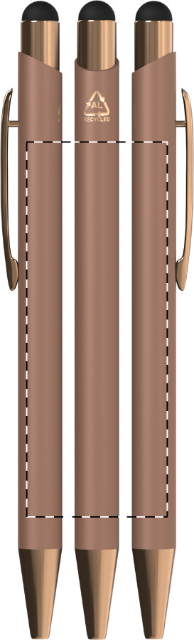 Růžové kuličkové pero z recyklovaného hliníku zaujme příjemným pogumovaným povrchem a luxusními detaily v barvě růžového zlata. Slouží zároveň jako dotykový stylus pro přesné ovládání chytrých telefonů nebo tabletů bez otisků prstů.