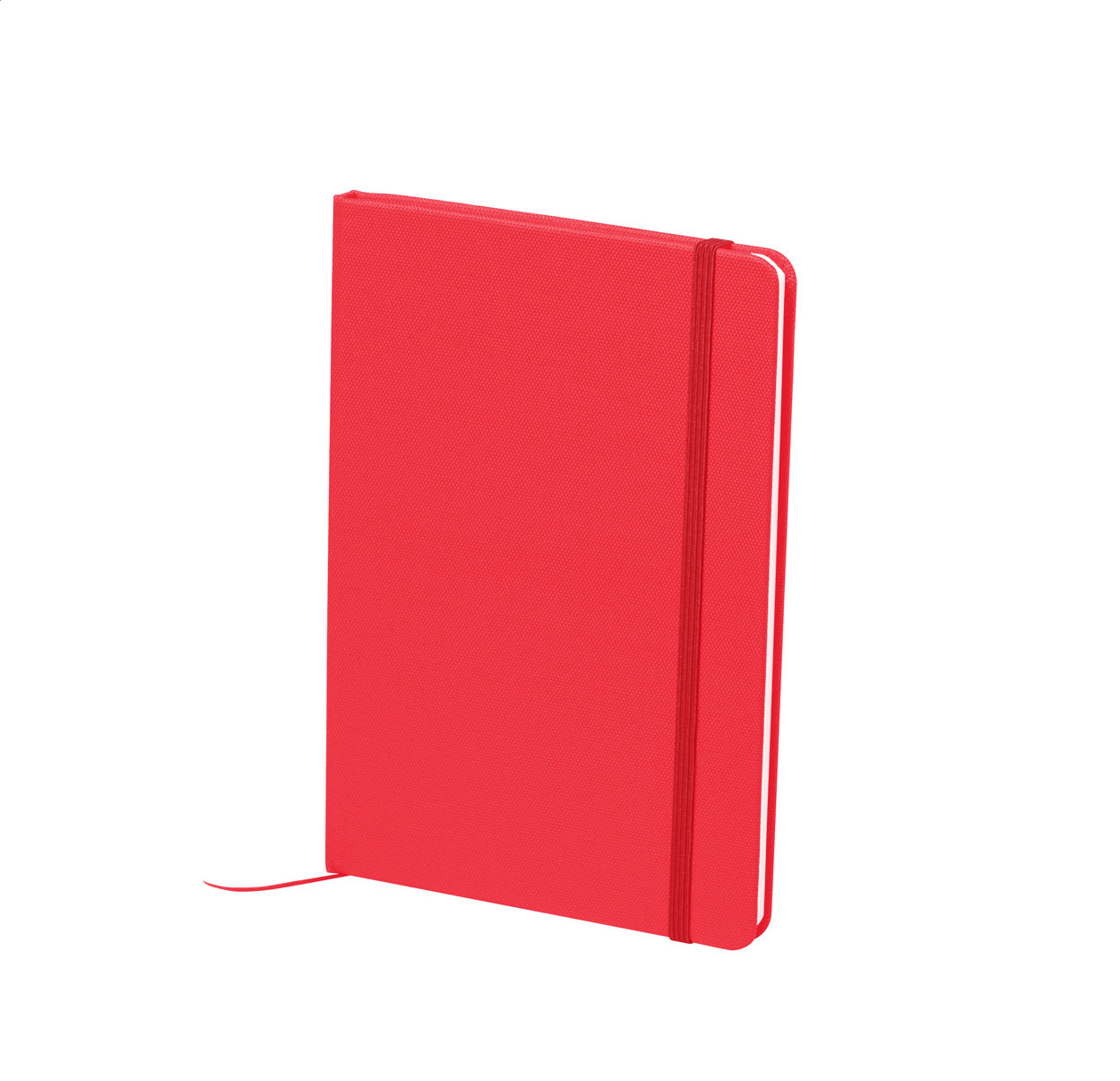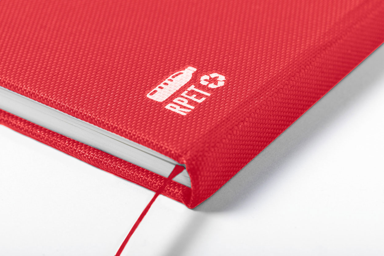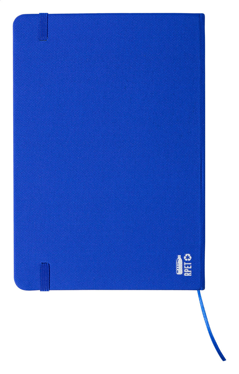 Zápisník formátu A5 s deskami potaženými RPET polyesterem. Blok obsahuje 80 linkovaných listů, záložku a gumičku na zavírání.
