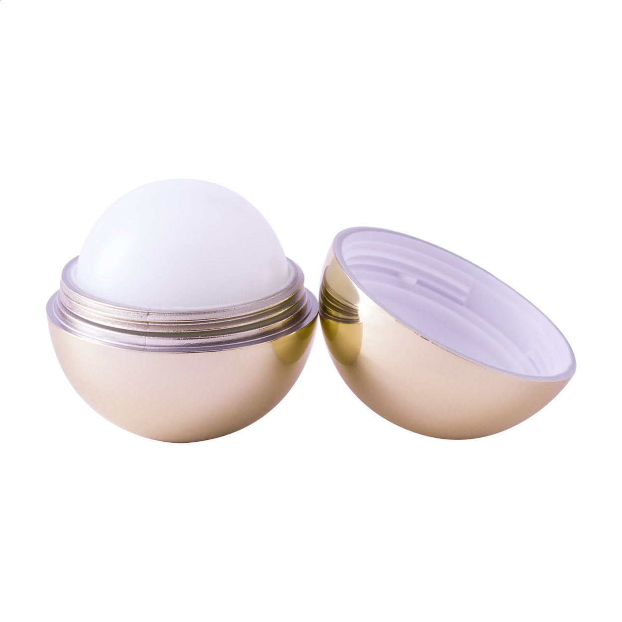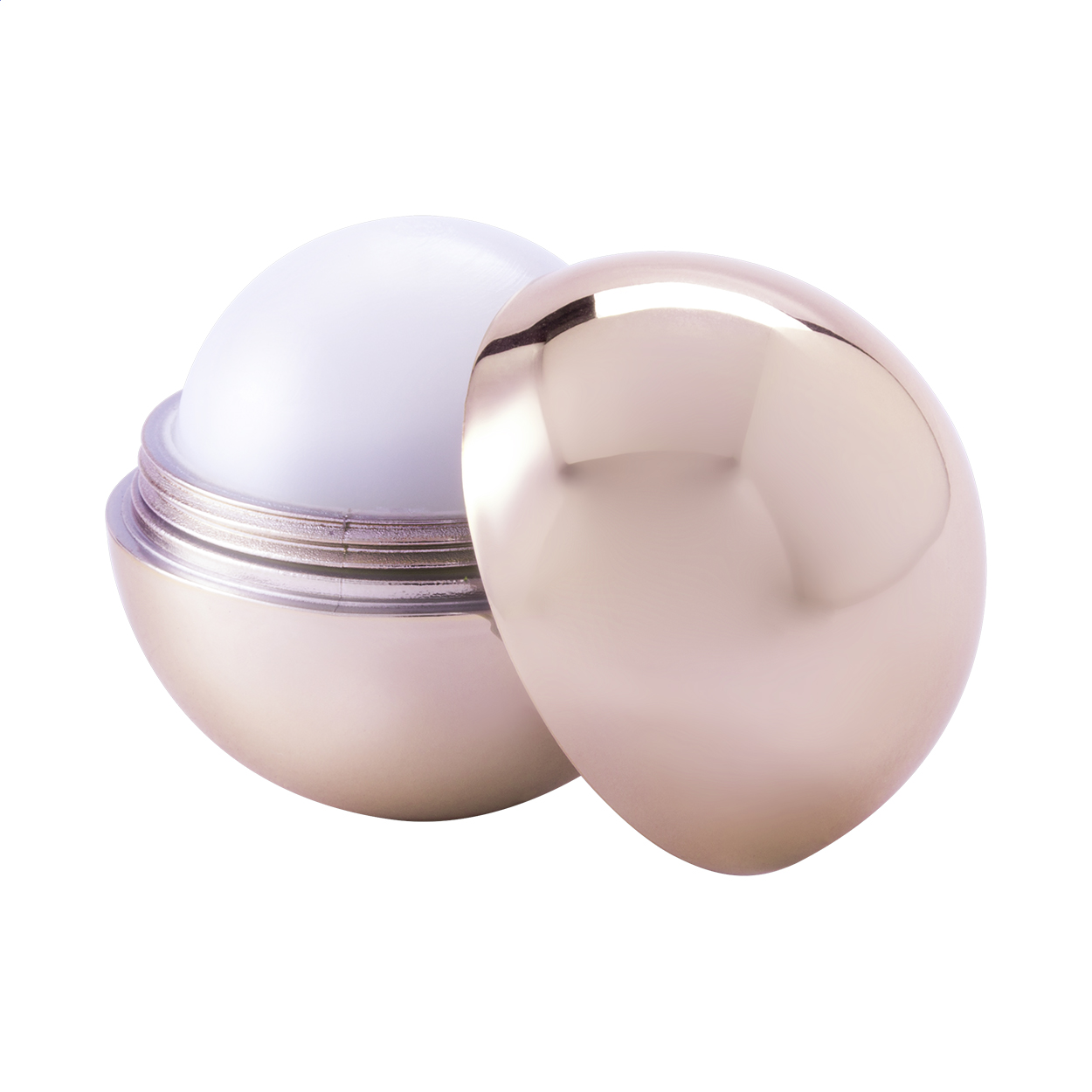 Kulatý balzám na rty v obalu s kovovou barvou, s ochranou SPF15.