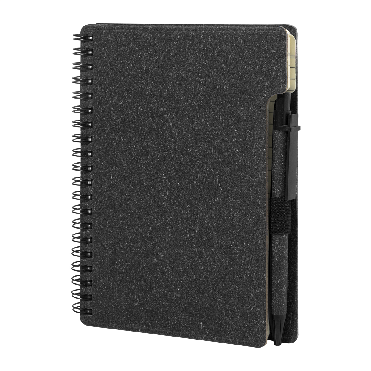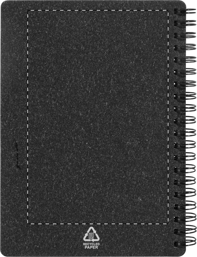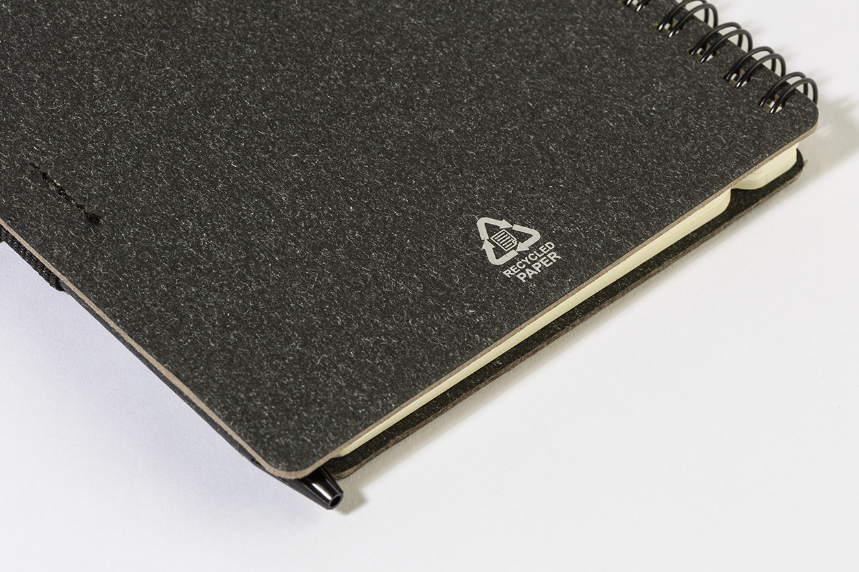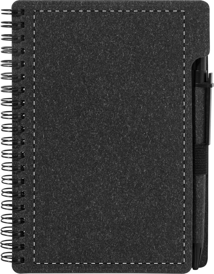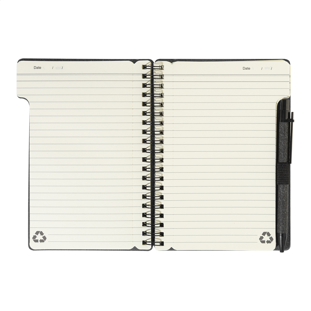Spirálový blok A6 z recyklovaného papíru s 80 linkovanými listy. Včetně recyklovaného papíru a kuličkového pera z recyklovaného PP s modrou náplní.