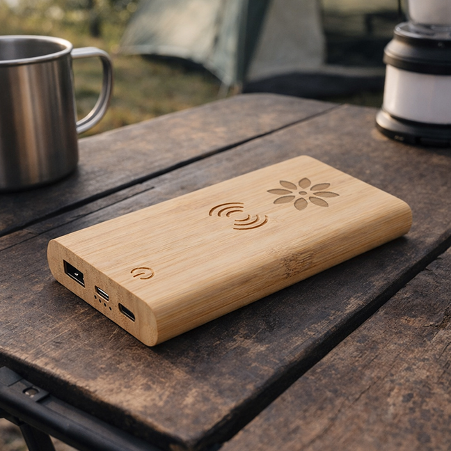 Bambusová powerbanka CHAPE spojuje přírodní vzhled s moderní technologií bezdrátového napájení. Pevné pouzdro z FSC certifikovaného materiálu chrání výkonný akumulátor a působí elegantně na každém pracovním stole.