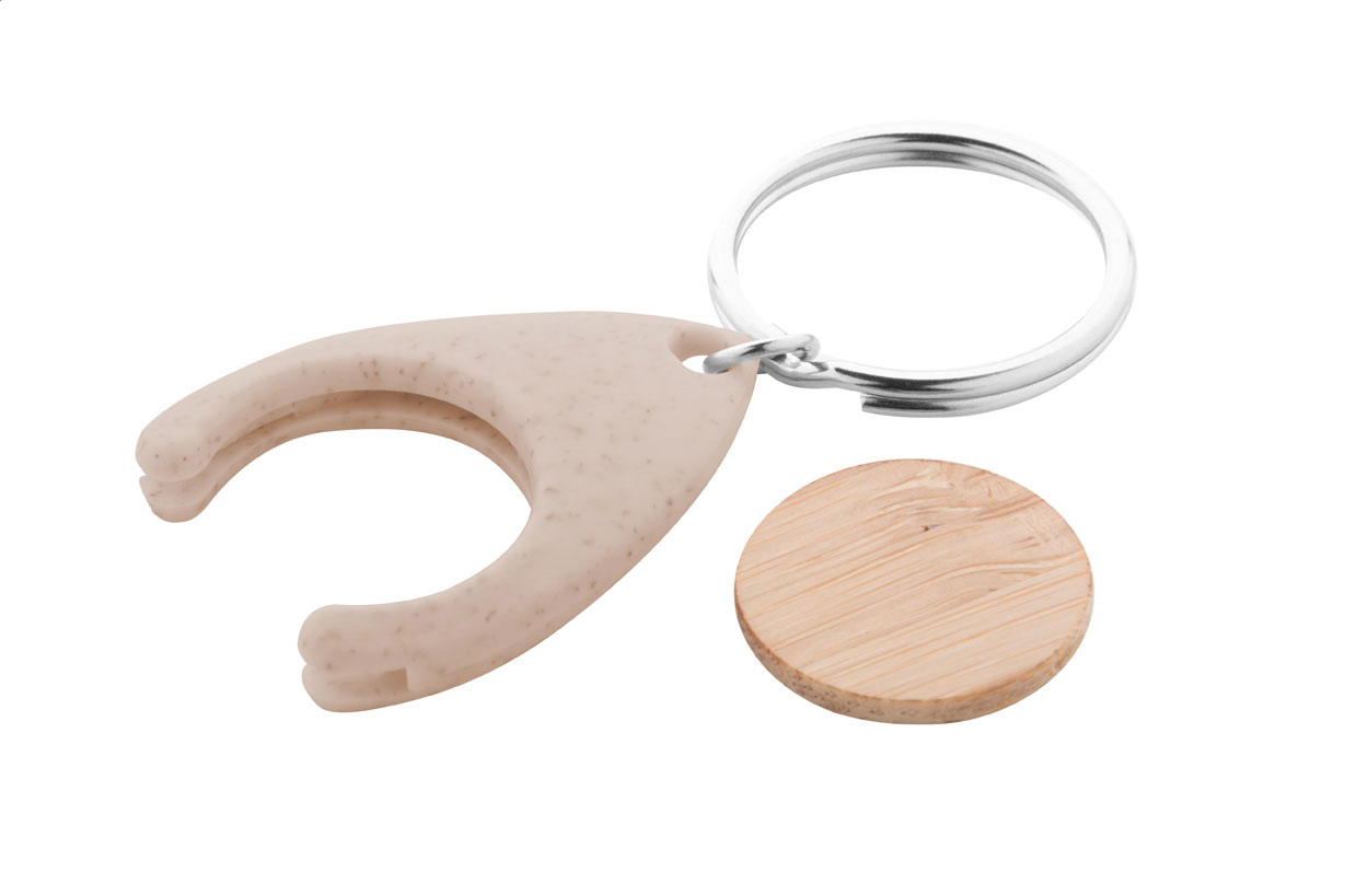 Ekologický materiál: Žeton je vyroben z bambusu, který je obnovitelným a udržitelným materiálem, a klíčenka je vyrobena z plastu z pšeničné slámy, což podporuje šetrnost k životnímu prostředí.