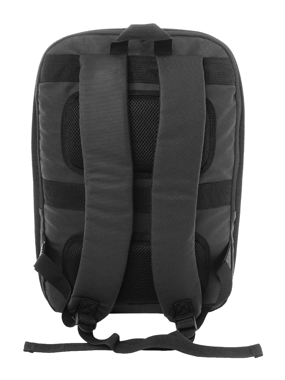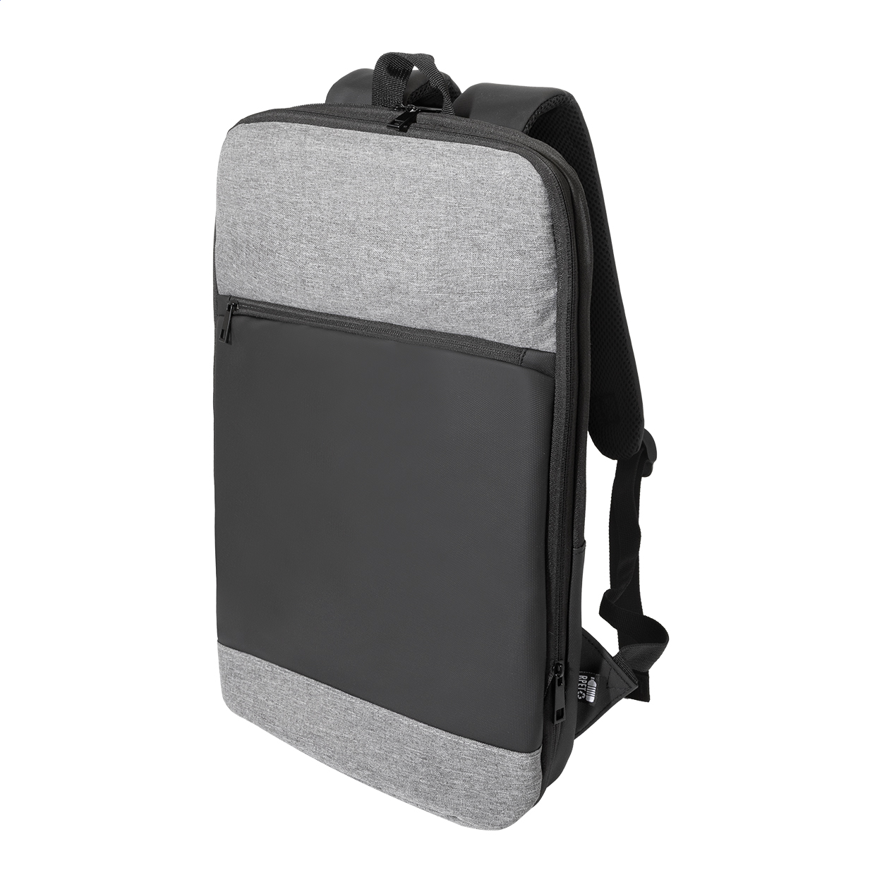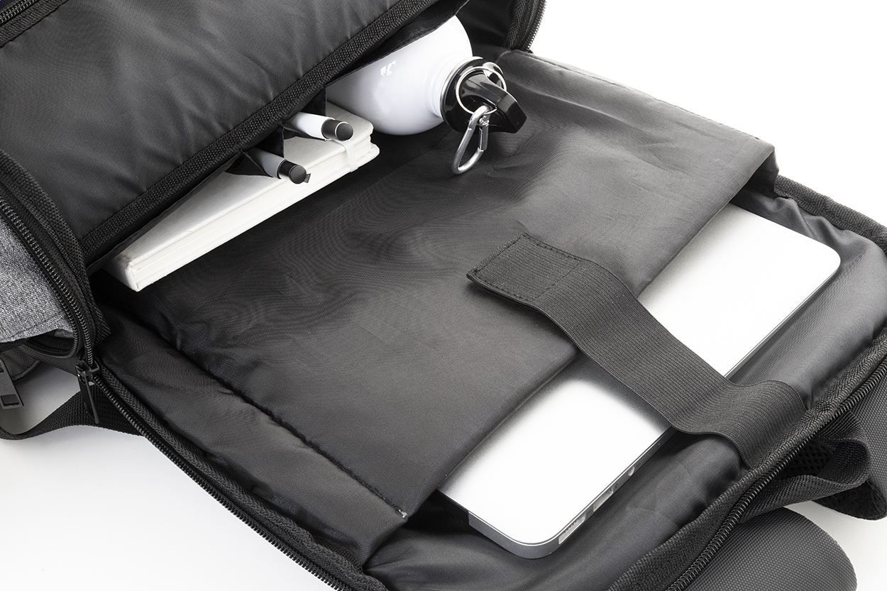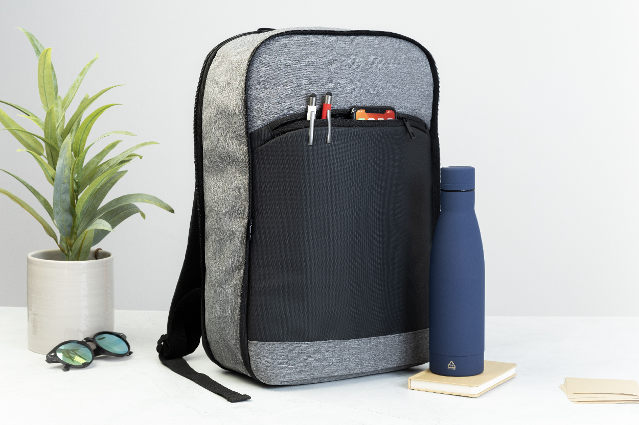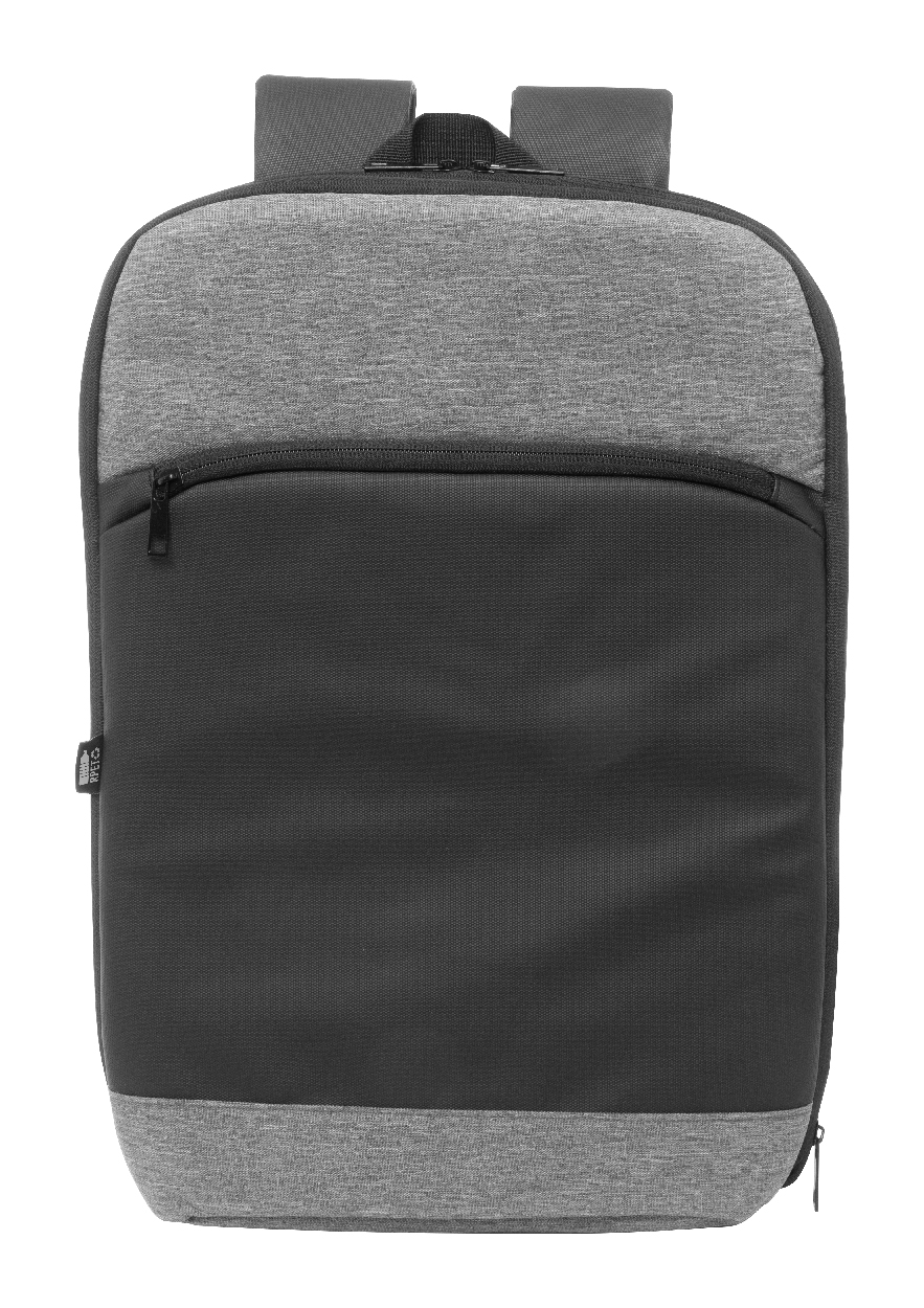 RPET rozšiřitelný batoh s hlavní přihrádkou na zip, přední kapsou na zip, polstrovanou přihrádkou na notebook (15") a přední stranou potaženou PU. S popruhem na vozík, polstrovanými zády a ramenními popruhy. 600D RPET polyester, s výrazným štítkem RPET.