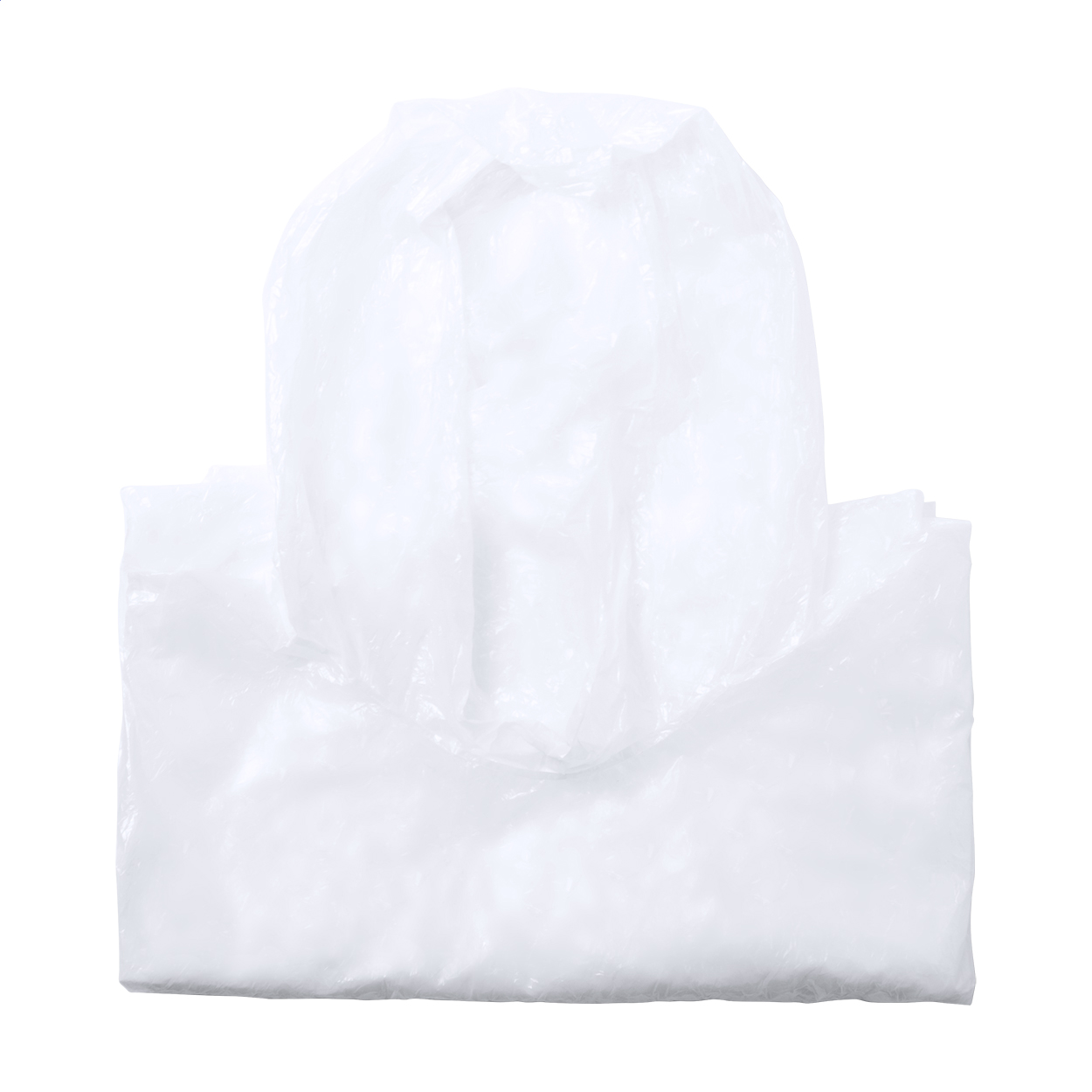 Transparentní LDPE pončo v jedné velikosti pro dospělé. V RPET polyesterovém pouzdru s výrazným štítkem RPET a hliníkovou karabinou.