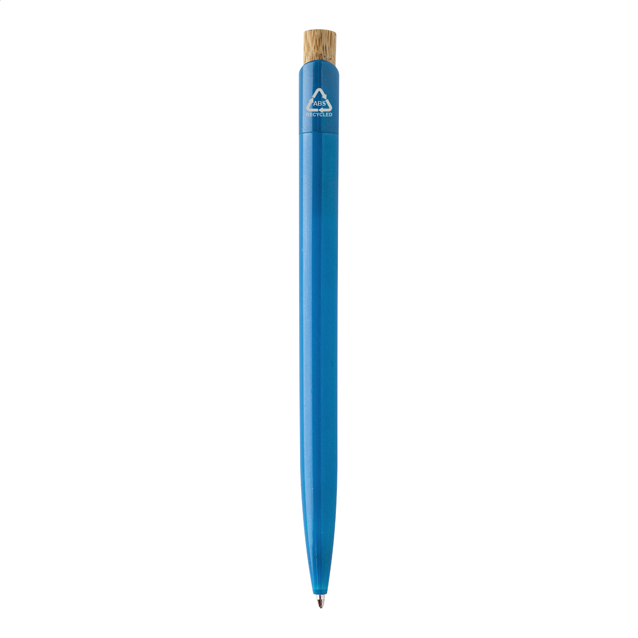 Kuličkové pero z recyklovaného ABS plastu s bambusovým tlačítkem. S modrou náplní.