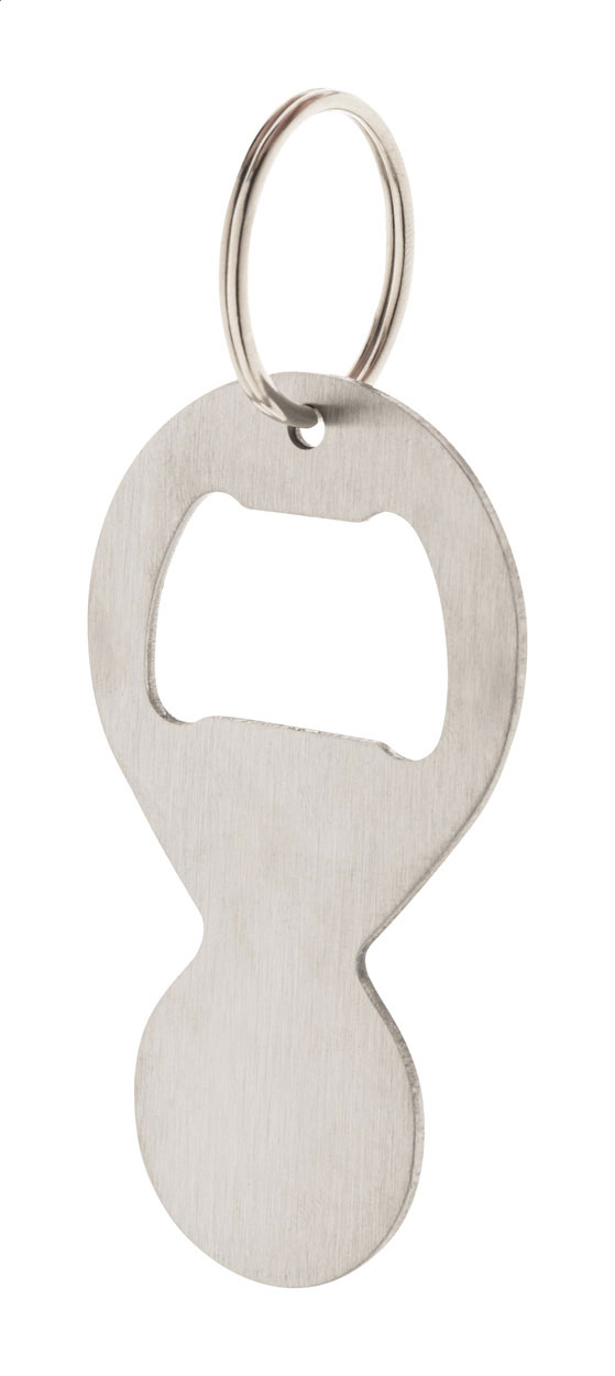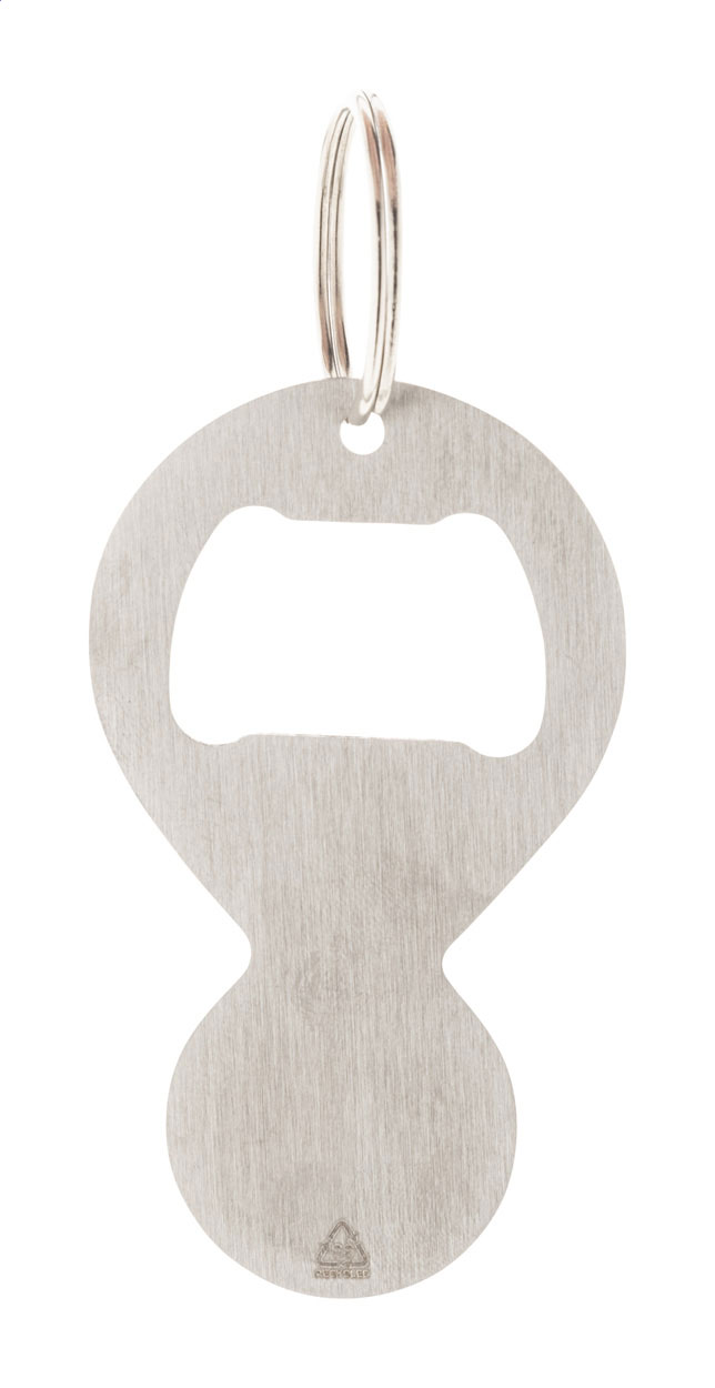 Přívěšek na klíče z recyklované nerezové oceli s otvírákem na láhve a žetonem do nákupního vozíku.