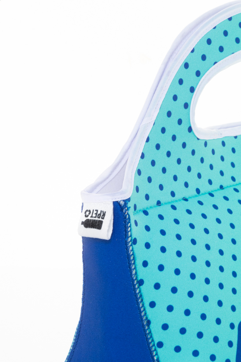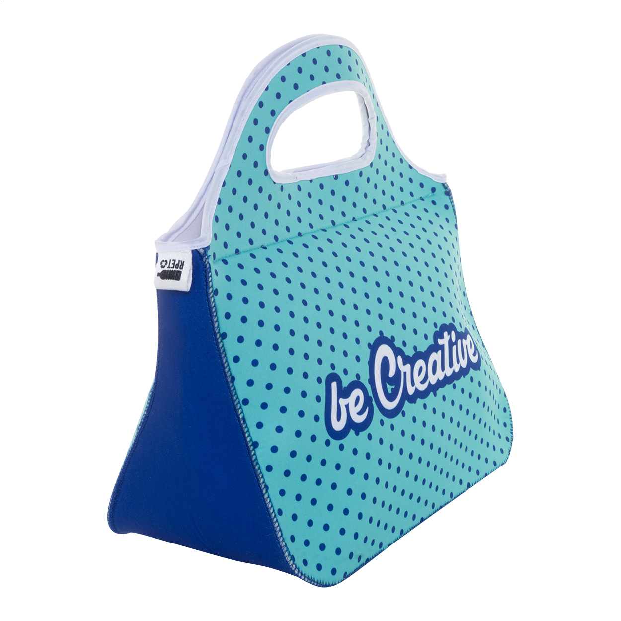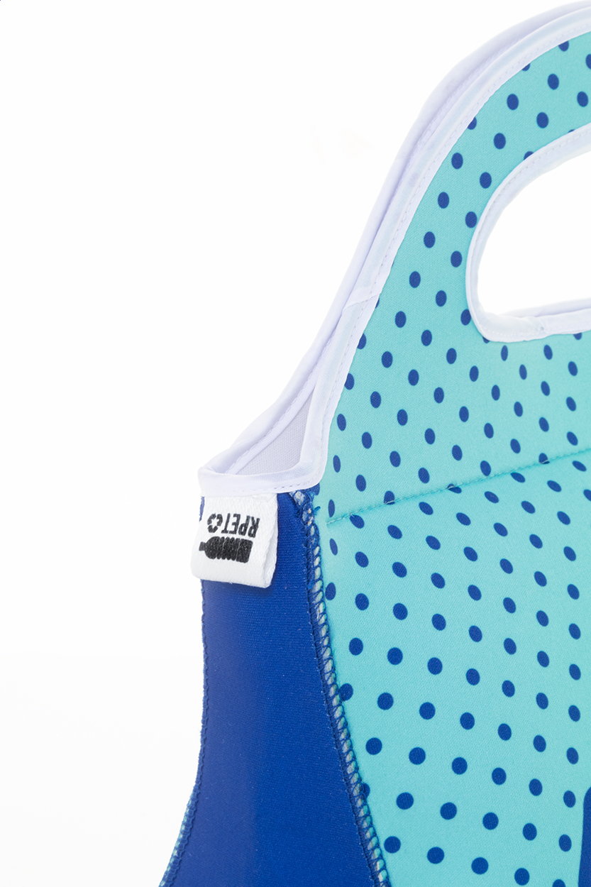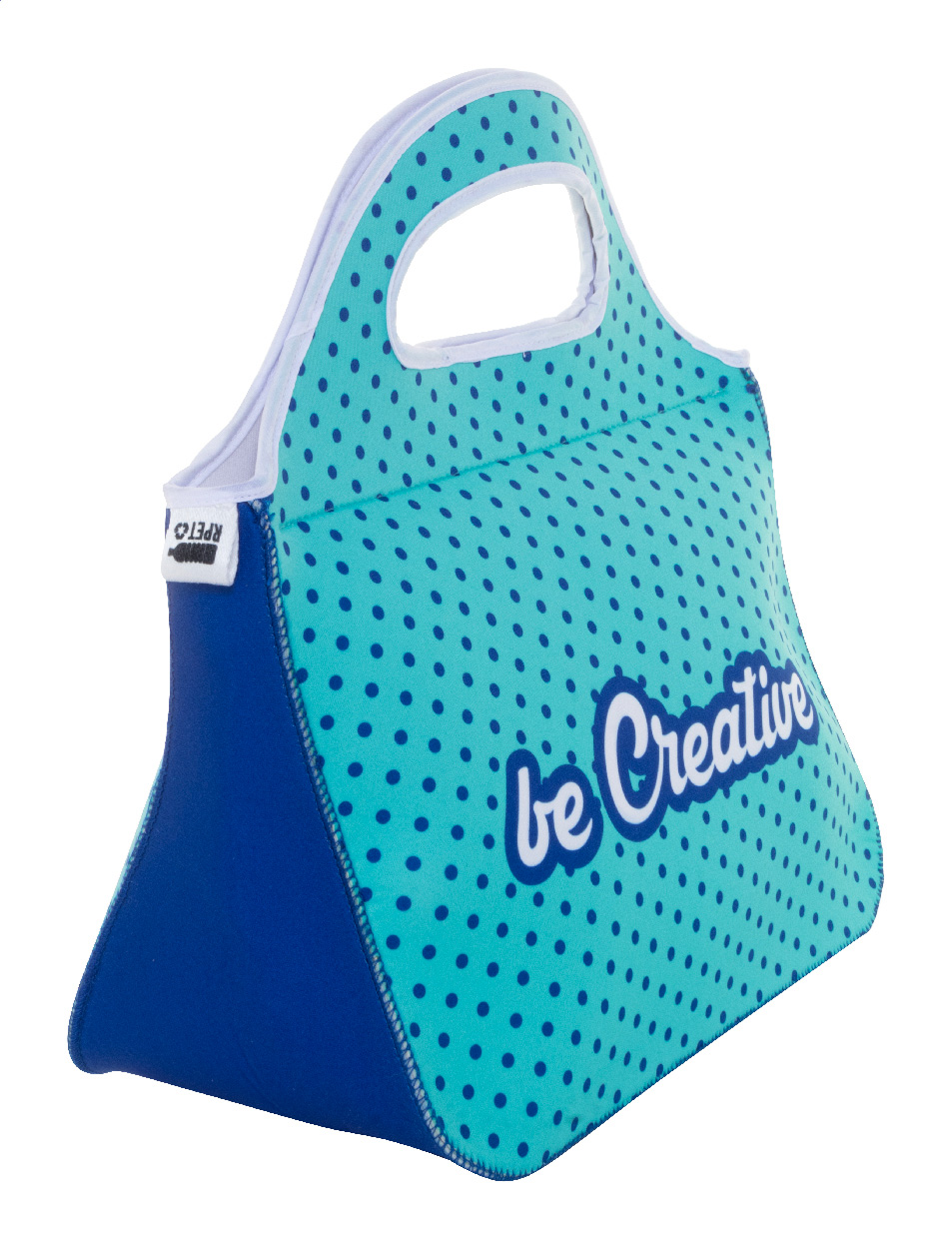 Taška na jídlo z neoprenu RPET vyrobená na zakázku s přihrádkou na zip a uchy. S celoplošným sublimačním potiskem a výraznou RPET etiketou. Min. mn.: 25 ks.
