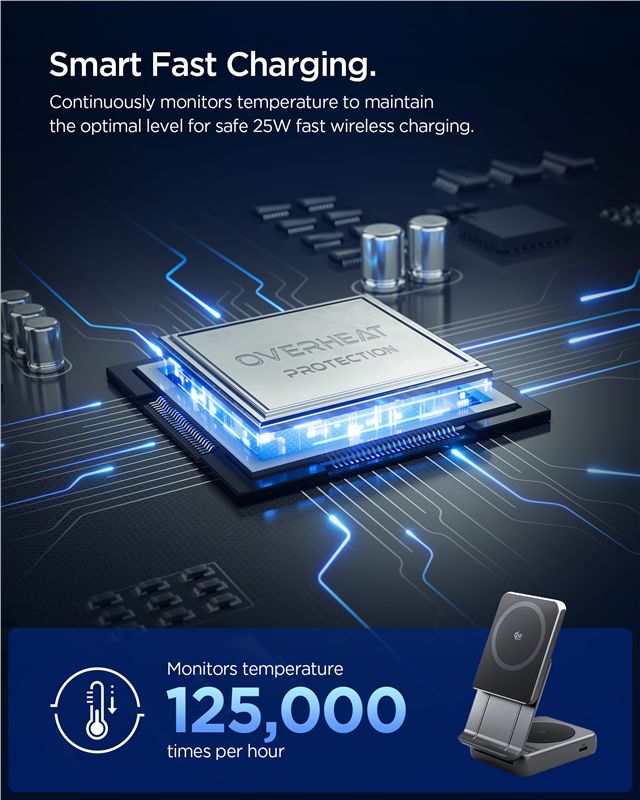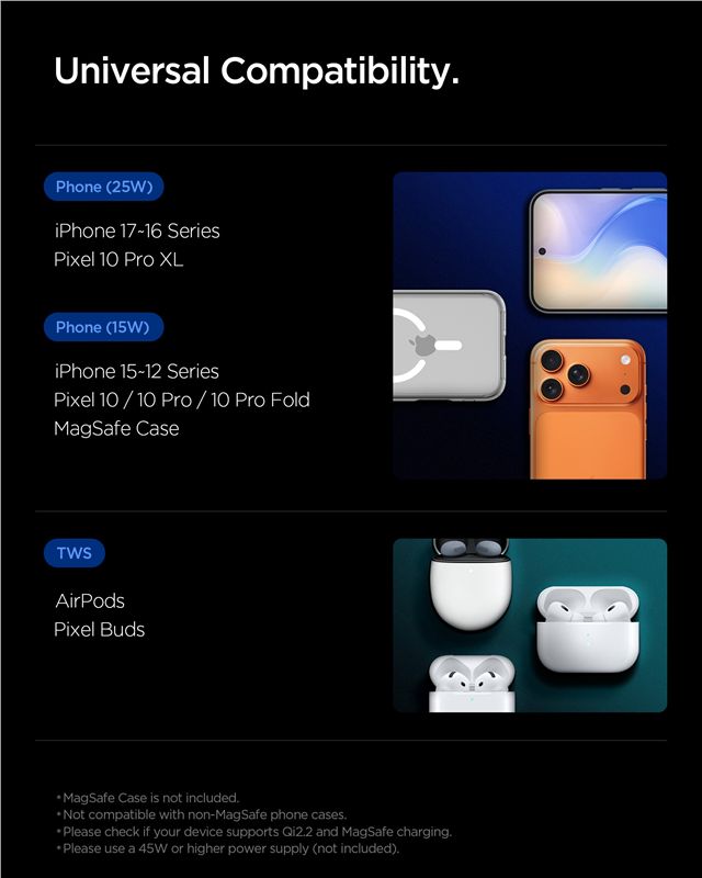 Bezdrátová nabíjecí stanice s podporou standardu Qi2 umožňuje současné napájení iPhonu s technologií MagSafe a bezdrátových sluchátek. Dosahuje výkonu až 25 W, čímž výrazně zkracuje čas strávený na kabelu. Silné integrované magnety zaručují přesné vycentrování telefonu, což je klíčové pro stabilní a efektivní přenos energie v horizontální i vertikální poloze.