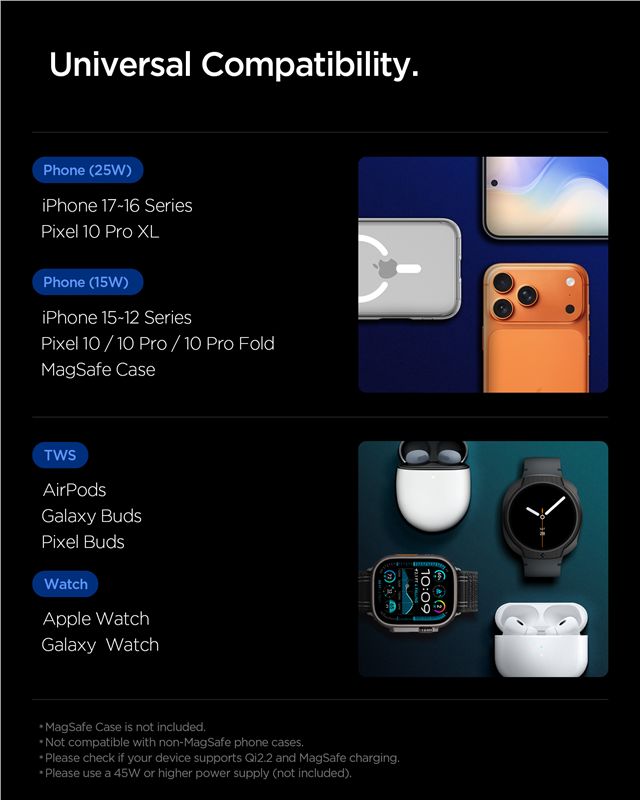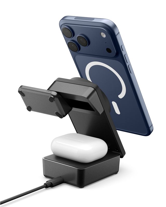 Univerzální nabíjecí základna typu 3-v-1 je navržena pro paralelní napájení chytrého telefonu, hodinek Apple Watch nebo Galaxy Watch a bezdrátových sluchátek. Využívá standard Qi2 s výkonem až 25 W pro telefon, zatímco pro hodinky a sluchátka jsou vyhrazeny samostatné plochy. Silné magnety N48 drží iPhone v přesné poloze pro nerušené nabíjení i během sledování displeje.