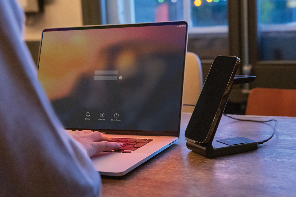 Univerzální bezdrátově nabíjecí stanice pro až 3 zařízení. Část určená pro telefon je vybavená duální cívkou s nejvyšším možným výkonem 15 W, dodatečná plocha pro další telefon nebo sluchátka s výkonem 5 W na zadní straně, závěsná část určená pro iWatch s výkonem 3 W. Vyrobeno z RCS recyklovaného ABS plastu. RCS (Recycled Claim Standard) je globální standard, který umožňuje ověřit použití recyklovaného materiálu v produktu napříč celým dodavatelským řetězcem. Celkový podíl recyklátu dle váhy pro
