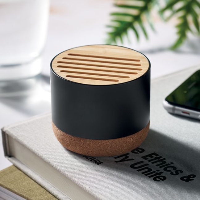 Bezdrátový reproduktor s krytem z recyklovaného hliníku, korkovou základnou a bambusovými detaily. Dobíjecí Li-ION 400 mAh baterie. Výstup: 3W, 3 Ohm a 5V. Doba hraní cca. 3h.