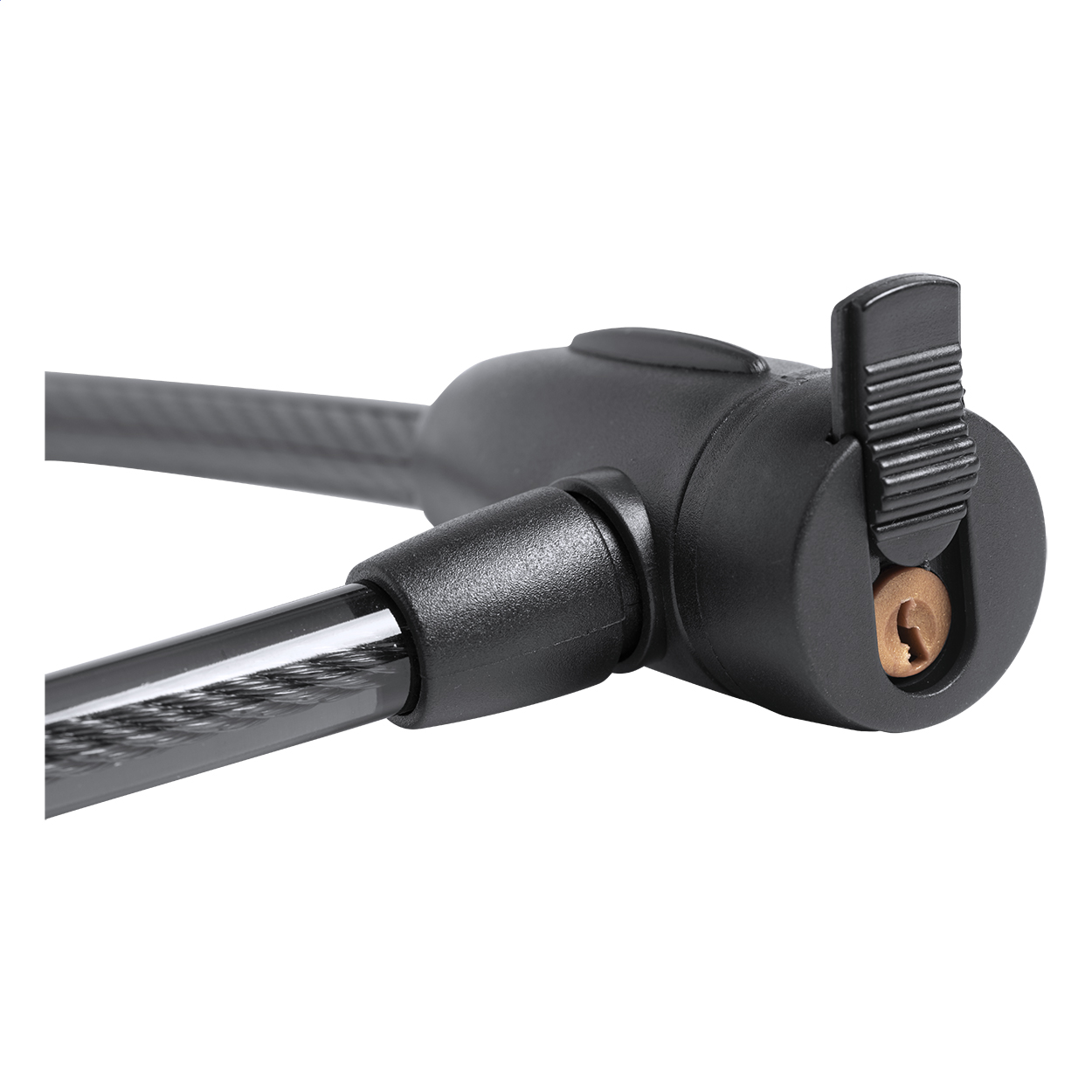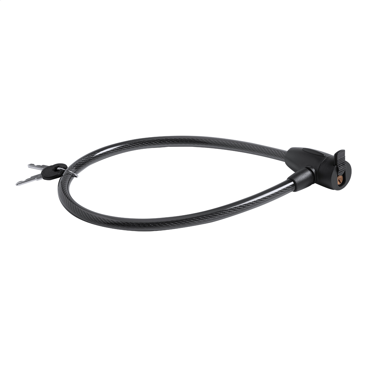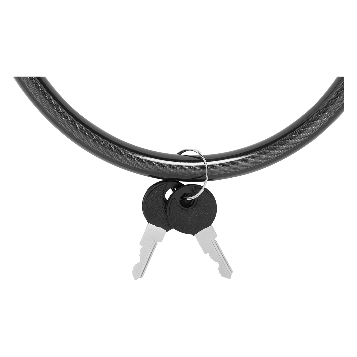 Zámek na kolo s ocelovým drátem potaženým PVC. Dodává se se 2 klíči.