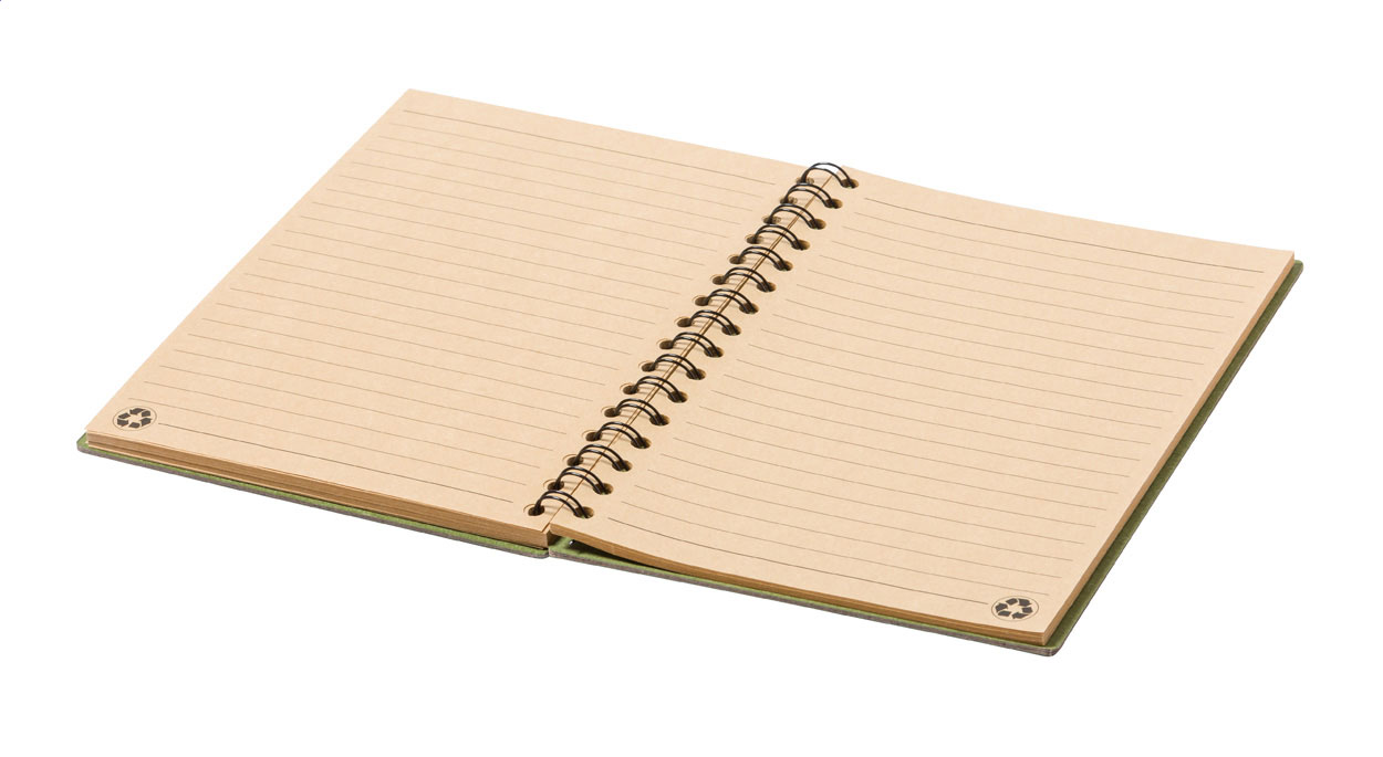 Linkovaný poznámkový blok z recyklovaného papíru formátu A5 s kroužkovou vazbou a pevnými deskami. Obsahuje 80 linkovaných listů.