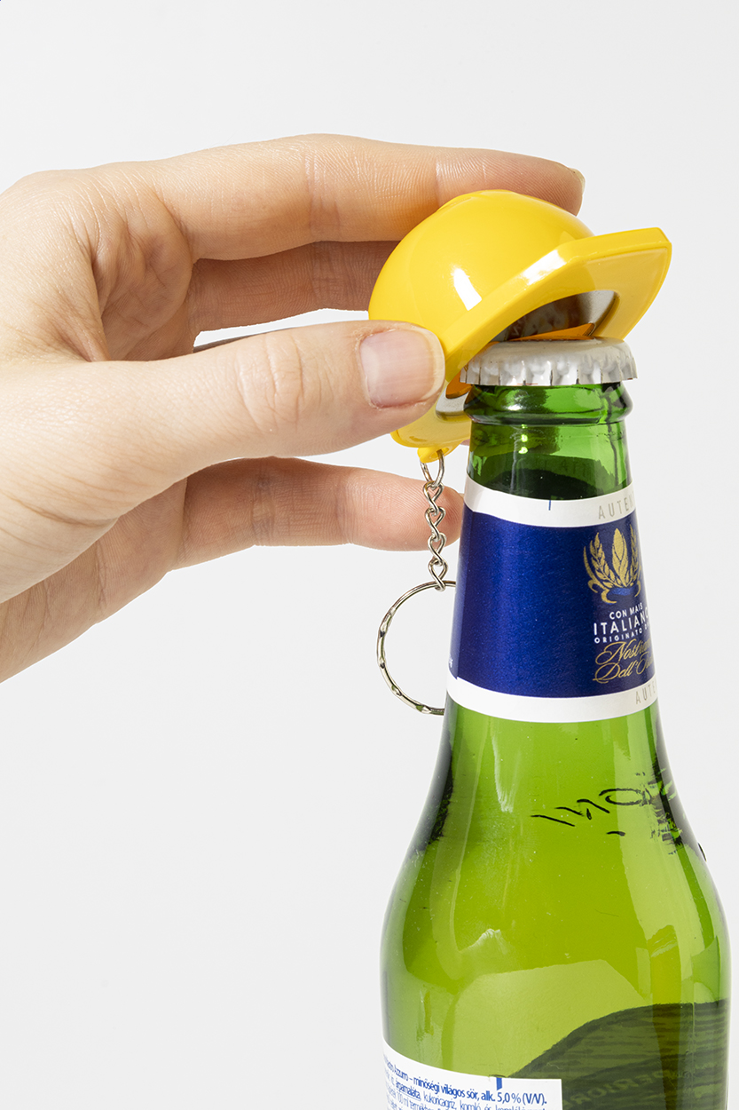 Přívěsek na klíče ve tvaru bezpečnostní přilby z recyklovaného ABS materiálu s otvírákem na lahve.