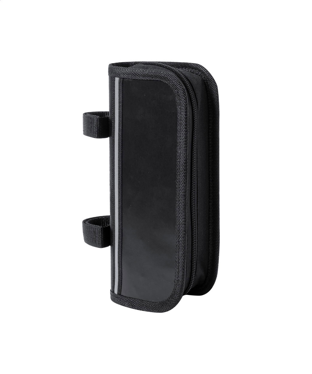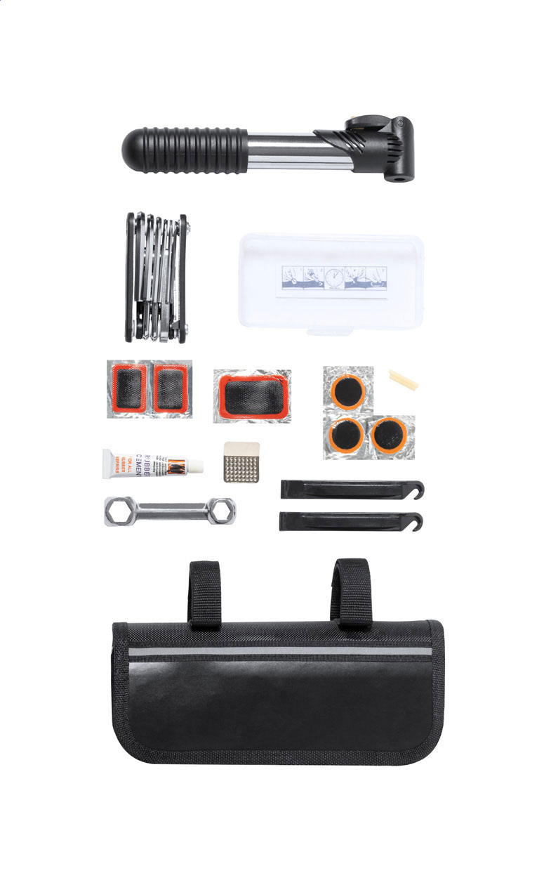 Sada na opravu jízdního kola v praktické tašce na rám kola. Obsahuje multifunkční nářadí s 15 funkcemi, šestihranný klíč, mini pumpičku a sadu na opravu defektu (2 páčky na pneumatiky, struhadlo a 6 záplat). Pouzdro z 600D polyesteru.