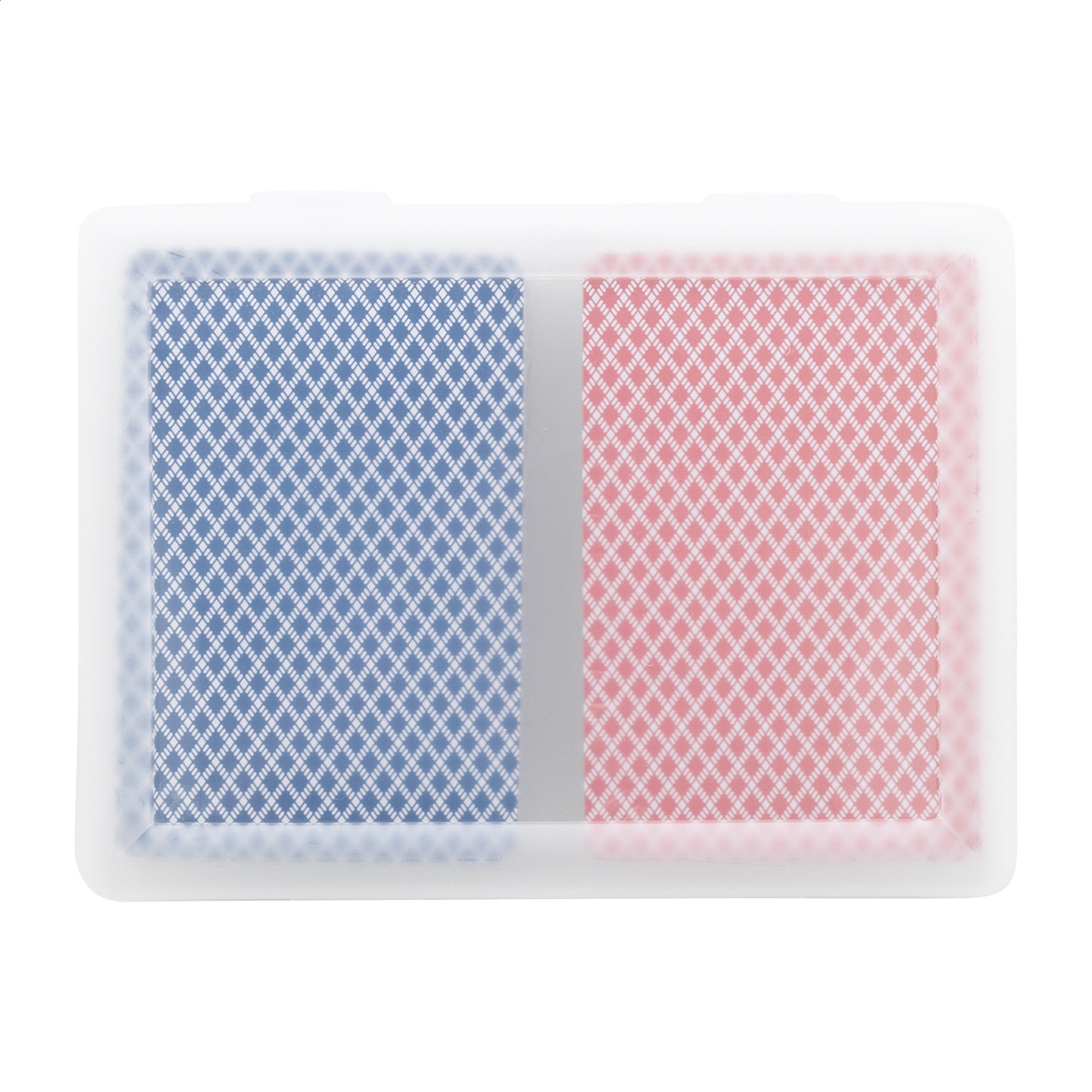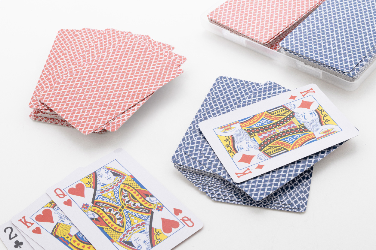 Sada klasických papírových hracích karet v recyklované PP krabičce. Obsahuje dva standardní balíčky 54 karet s červenou a modrou zadní stranou.