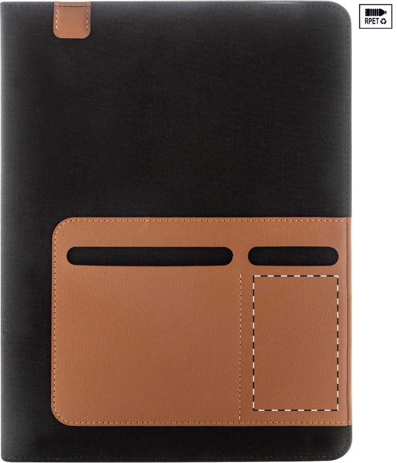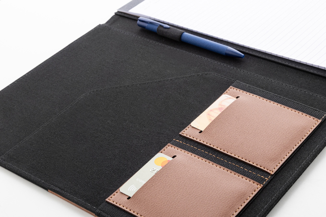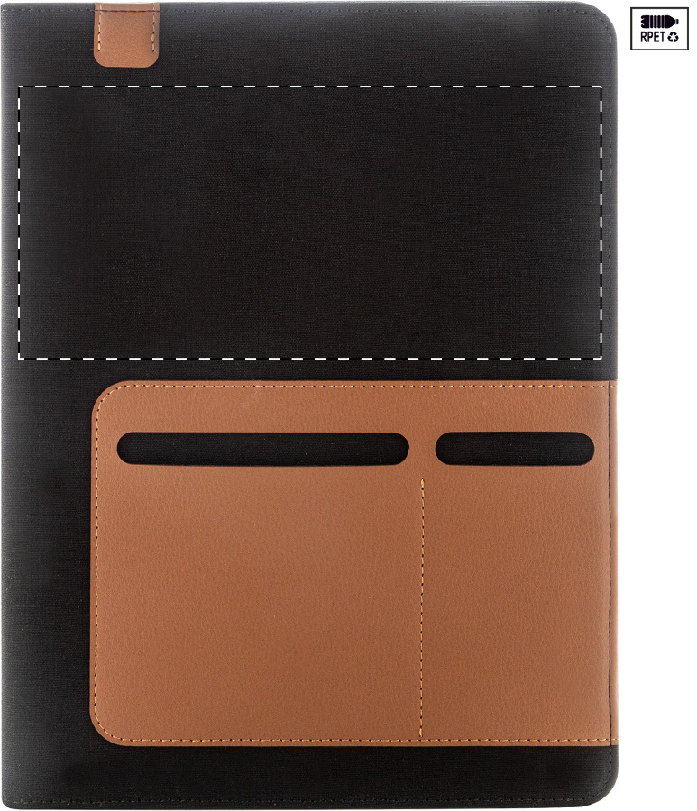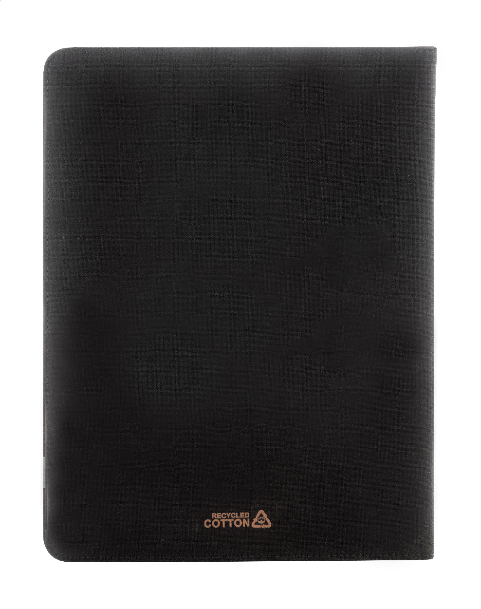 Složka na dokumenty A4 z recyklovaného plátna a recyklované umělé kůže s několika předními a vnitřními kapsami. S blokem na 20 linkovaných listů z recyklovaného papíru. 70 % recyklované bavlny a 30 % RPET polyesteru.