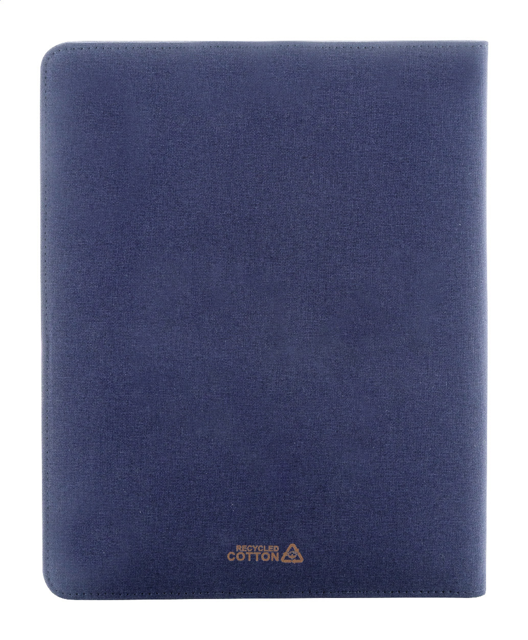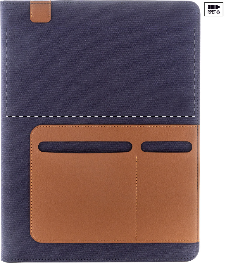 Složka na dokumenty A4 z recyklovaného plátna a recyklované umělé kůže s několika předními a vnitřními kapsami. S blokem na 20 linkovaných listů z recyklovaného papíru. 70 % recyklované bavlny a 30 % RPET polyesteru.