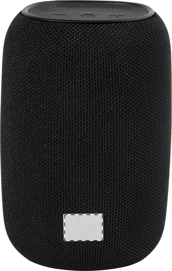 Moderní černý bezdrátový reproduktor spojuje šetrnost k životnímu prostředí využitím recyklovaného ABS plastu a RPET polyesterové síťoviny. Pevná hliníková karabina umožňuje snadné zavěšení na batoh, zatímco elegantní kovový štítek slouží jako vkusné místo pro umístění loga.