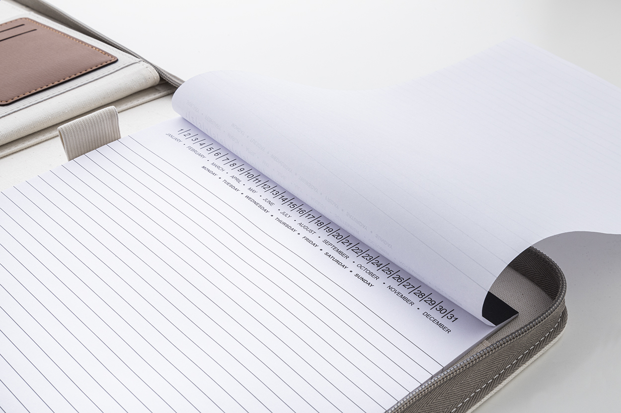 Sloha na dokumenty A4 na zip s uchem z recyklovaného plátna a recyklované PU kůže a s několika vnitřními kapsami s organizérem. S 20 linkovanými listy poznámkového bloku z recyklovaného papíru. 70% recyklovaná bavlna a 30% RPET polyester.