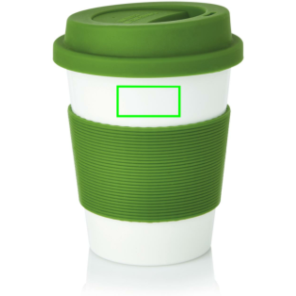 Umožňuje pohodlné pití 350 ml horkého nápoje a výborně se hodí na ranní latte nebo bylinkový čaj. Zelený silikonový prstenec chrání dlaně před horkým povrchem a těsnicí víčko zabraňuje nechtěnému vylití tekutiny během pohybu.