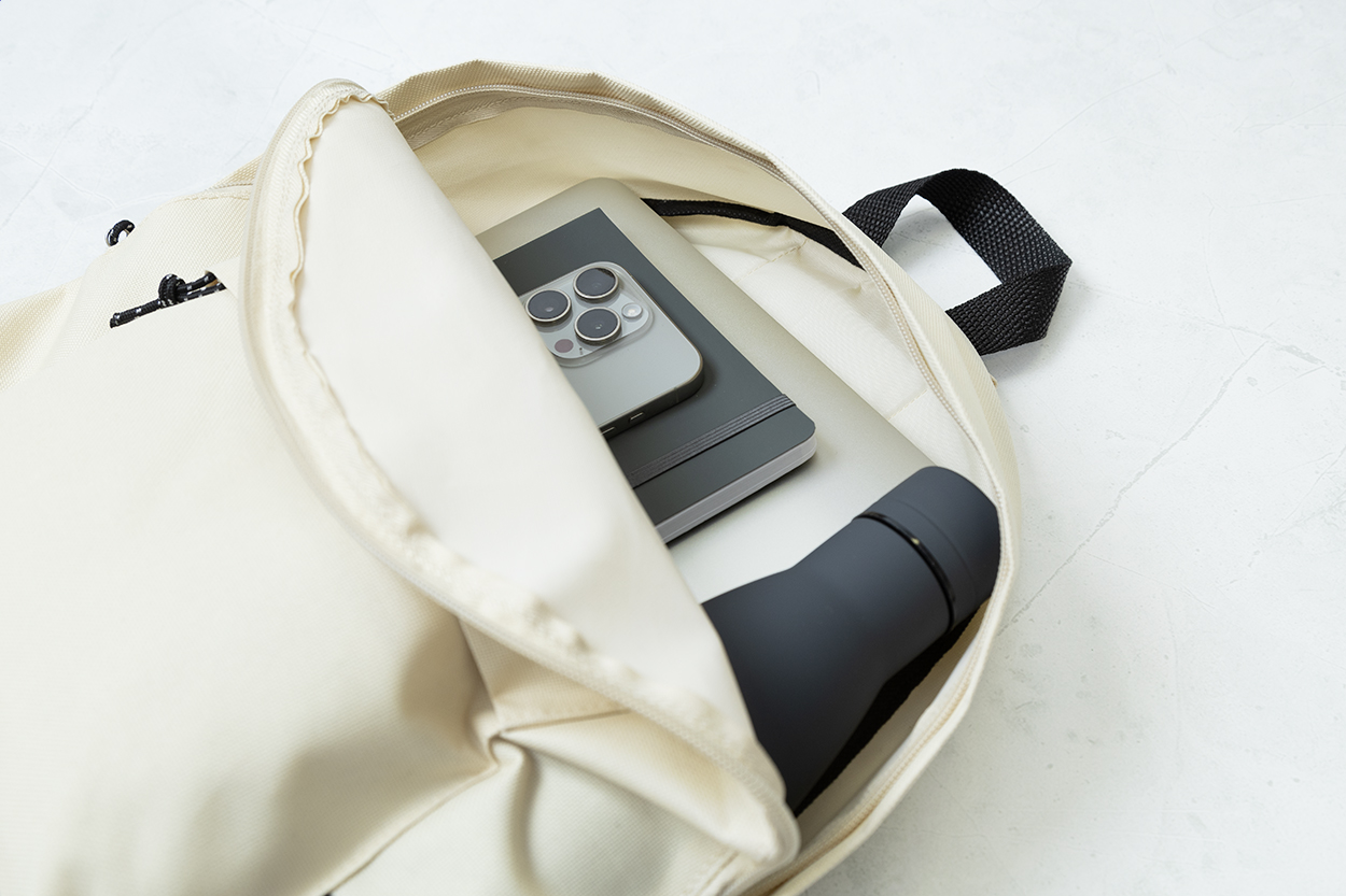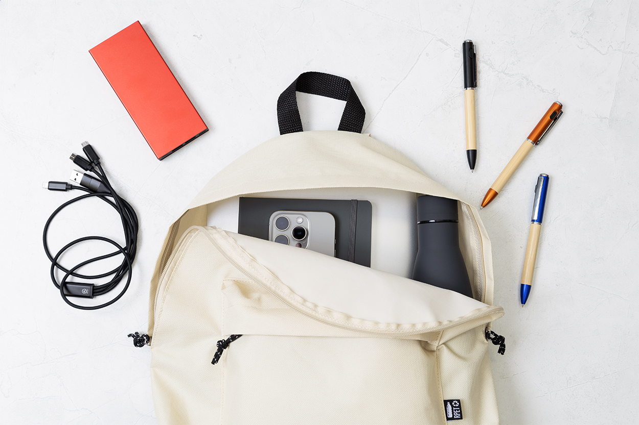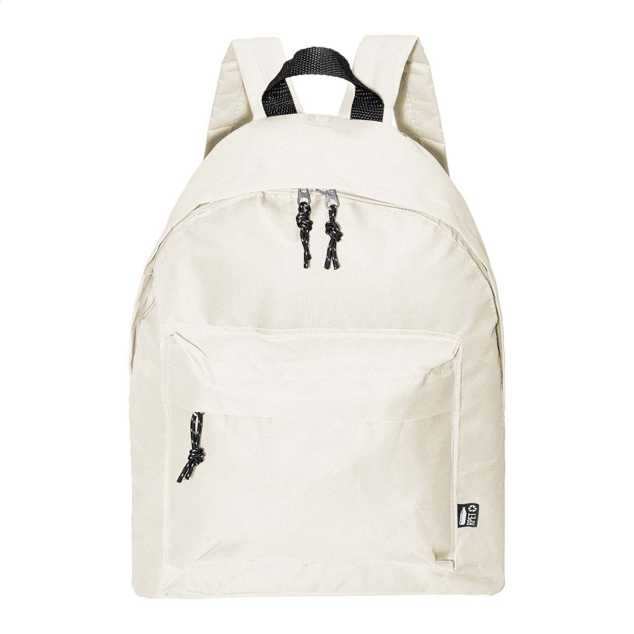 RPET batoh s hlavním prostorem na zip, přední kapsou na zip, polstrovanými zády a ramenními popruhy. Polyester 600D RPET, s výrazným štítkem RPET.