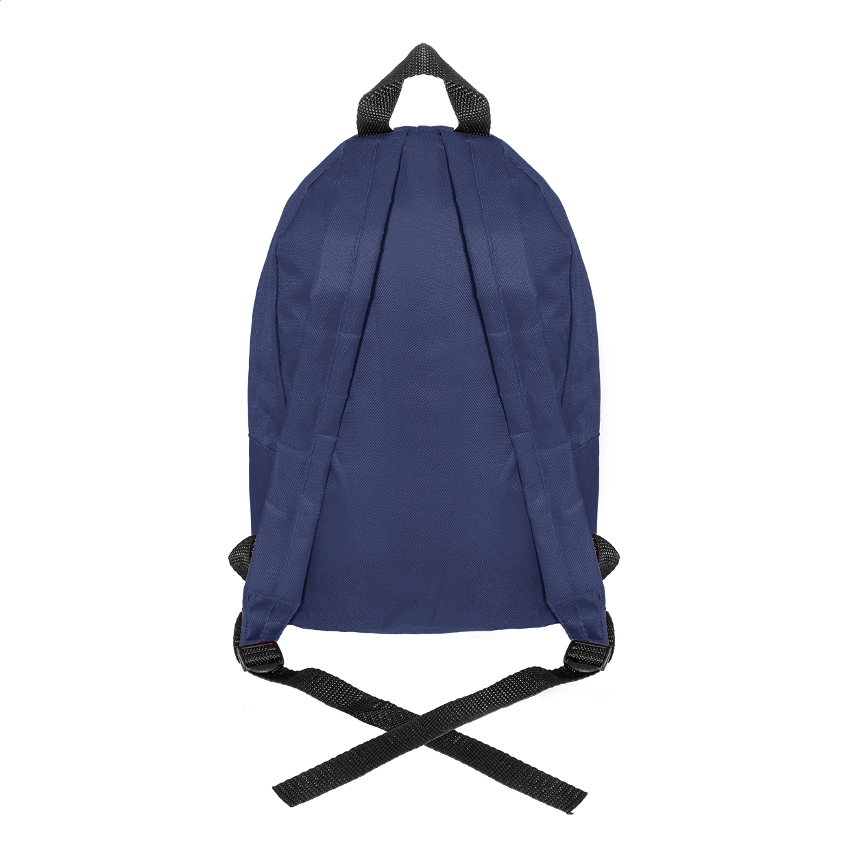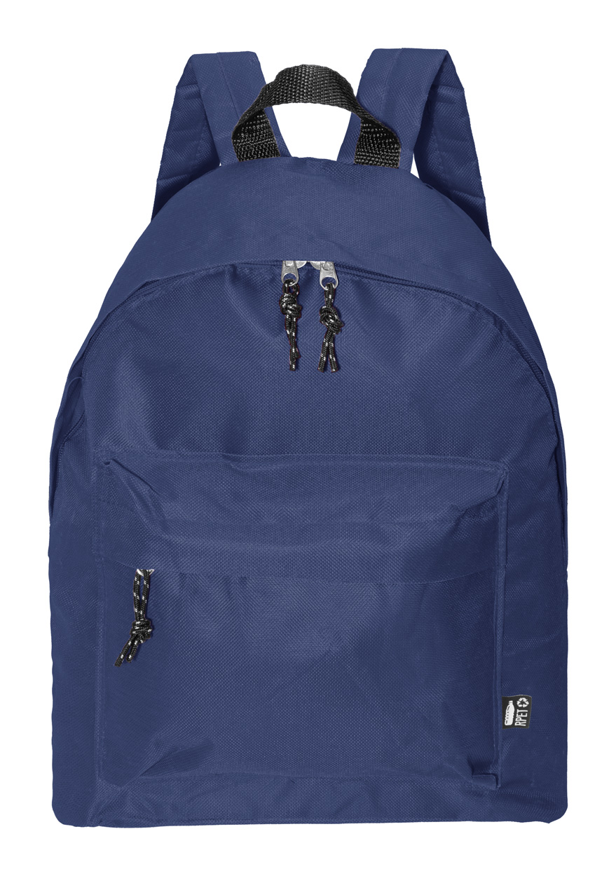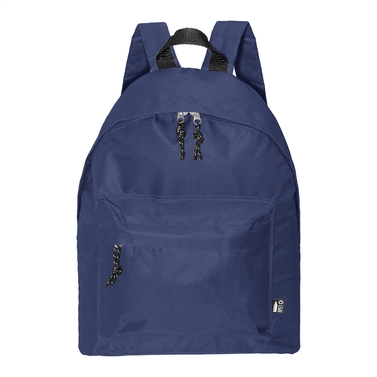RPET batoh s hlavním prostorem na zip, přední kapsou na zip, polstrovanými zády a ramenními popruhy. Polyester 600D RPET, s výrazným štítkem RPET.