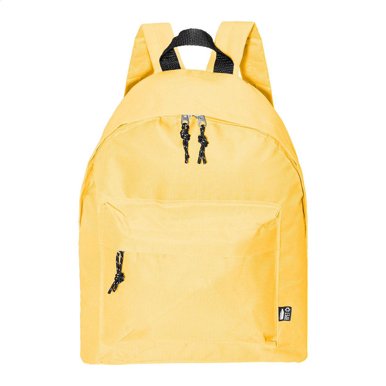 RPET batoh s hlavním prostorem na zip, přední kapsou na zip, polstrovanými zády a ramenními popruhy. Polyester 600D RPET, s výrazným štítkem RPET.
