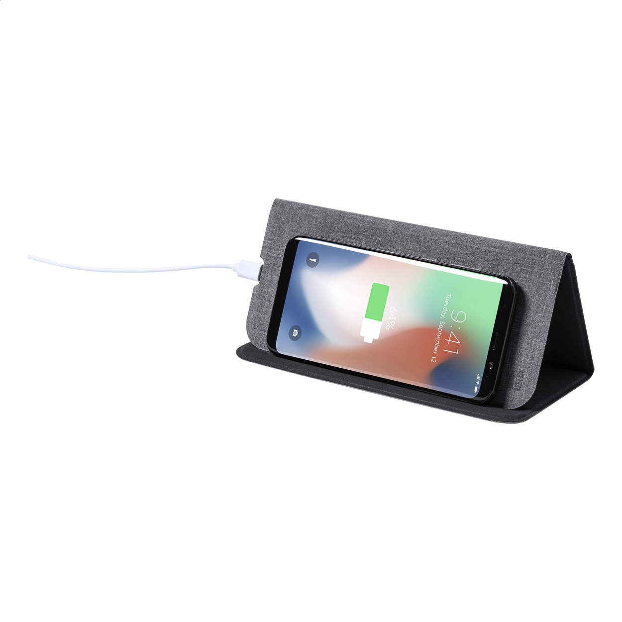 Polyesterová podložka pod myš vyrobená z recyklovaného PET materiálu s vestavěnou bezdrátovou rychlonabíječkou (10 W) a funkcí stojánku pro mobilní telefon. Včetně nabíjecího USB kabelu.