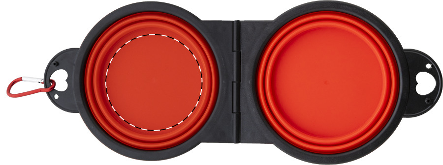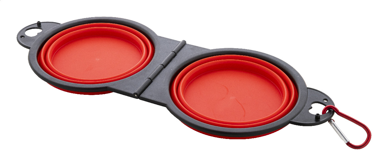 Skládací miska pro domácí mazlíčky z odolného TPE se dvěma přihrádkami o objemu 450 ml a barevně sladěnou hliníkovou karabinou.