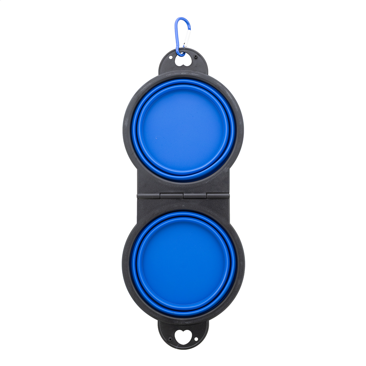 Skládací miska pro domácí mazlíčky z odolného TPE se dvěma přihrádkami o objemu 450 ml a barevně sladěnou hliníkovou karabinou.