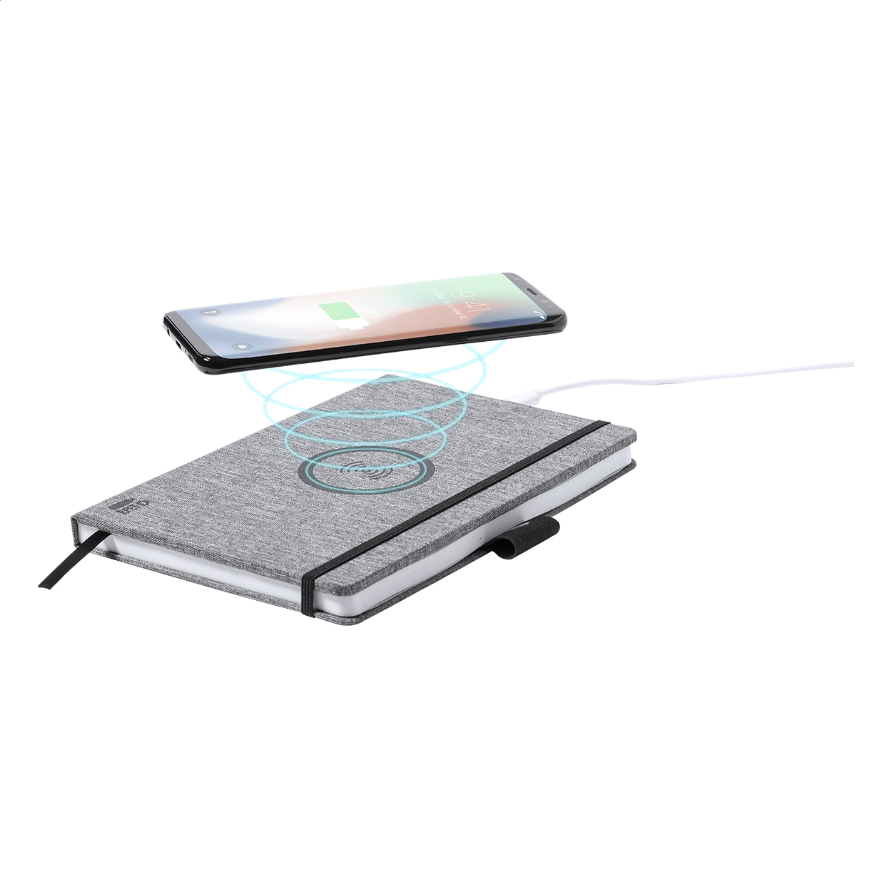 Poznámkový blok formátu A5 s deskami potaženými polyesterem z recyklovaného PET s vestavěnou bezdrátovou rychlonabíječkou (10 W). Zápisník obsahuje 80 linkovaných listů. Včetně nabíjecího USB kabelu. Polyester 300D RPET.