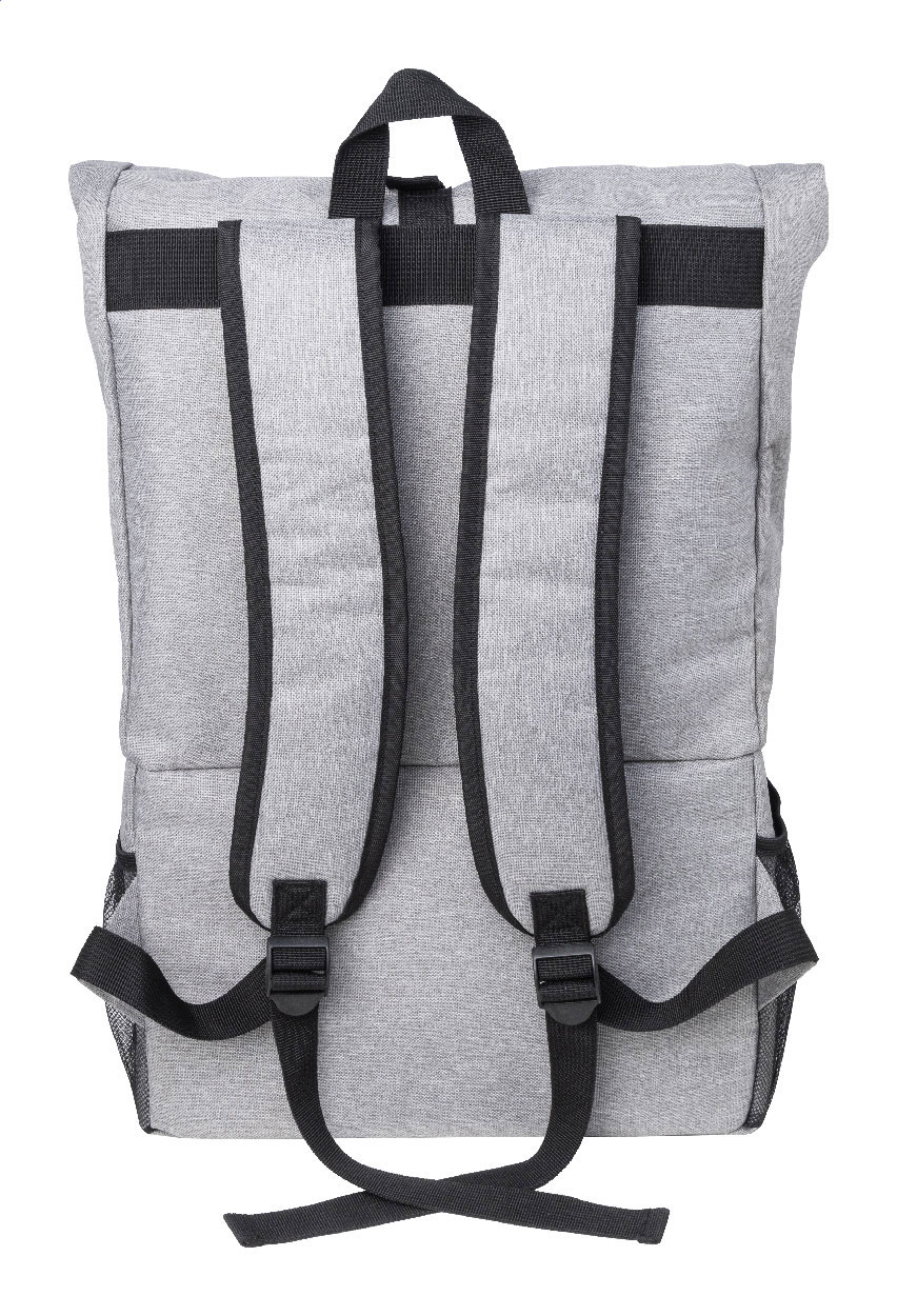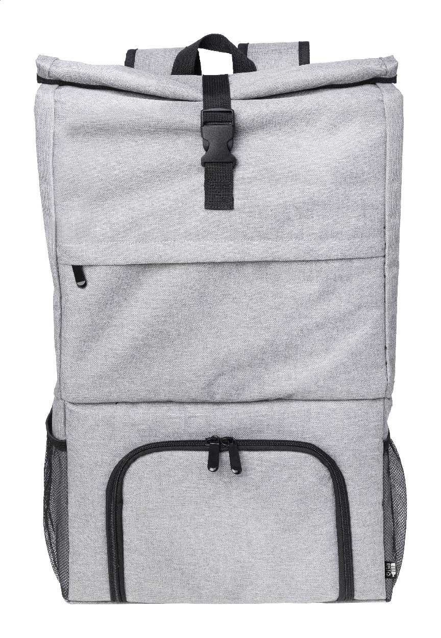 Rolltop RPET chladící batoh s PEVA polstrovanou chladicí přihrádkou na zip na jídlo. S hlavní přihrádkou na sponu, přední kapsou na zip, bočními síťovanými kapsami a polstrovanými ramenními popruhy. 600D RPET polyester s výrazným štítkem RPET.