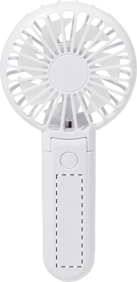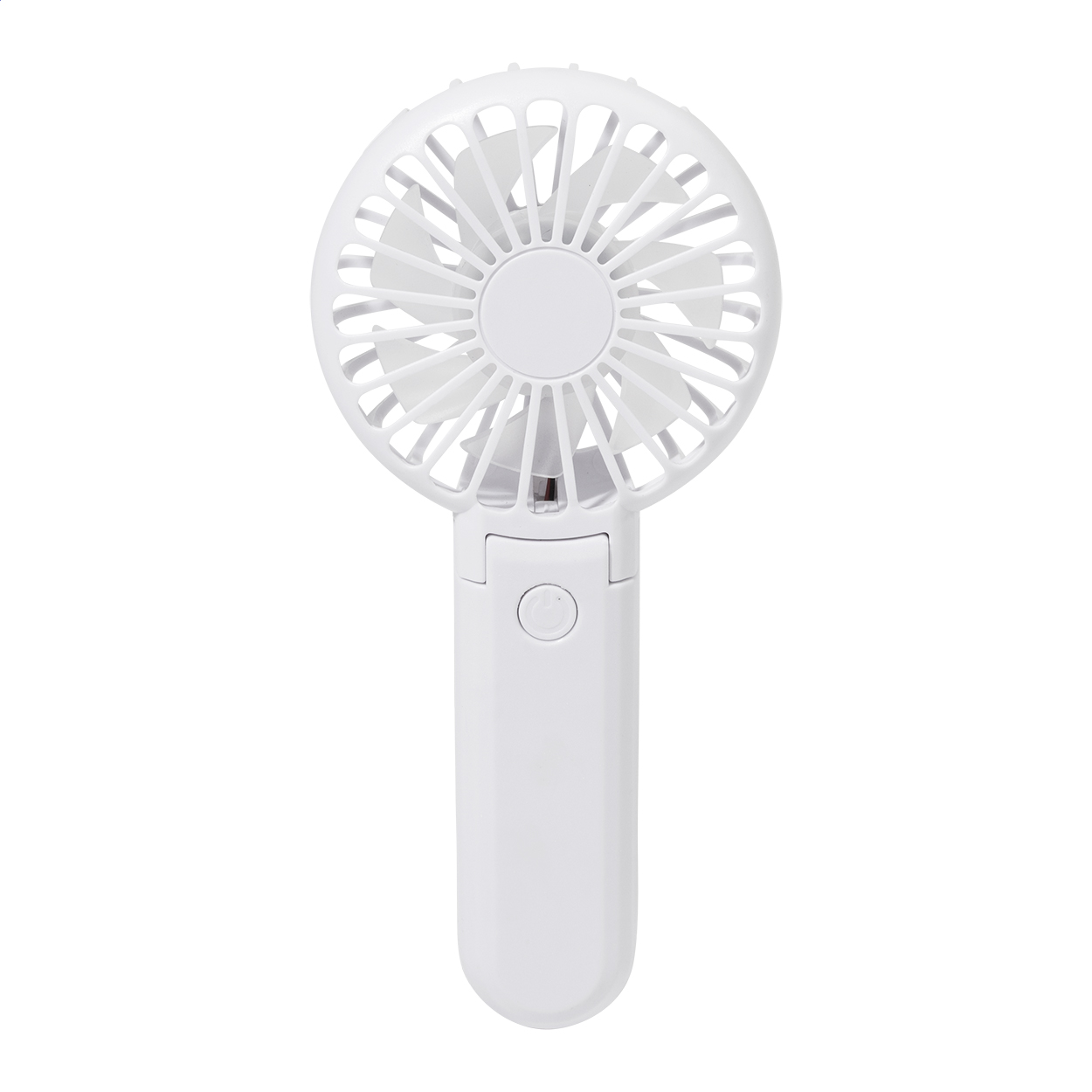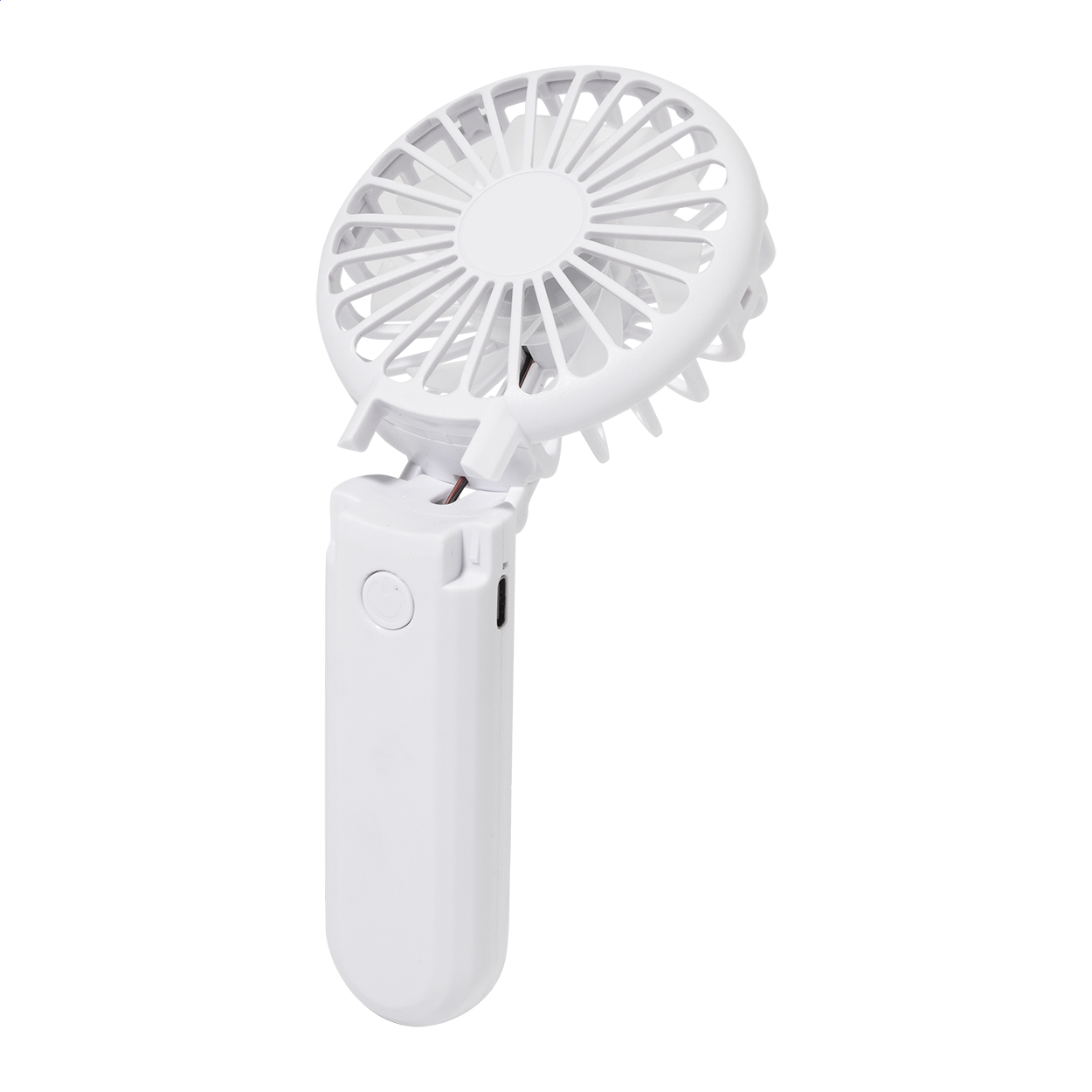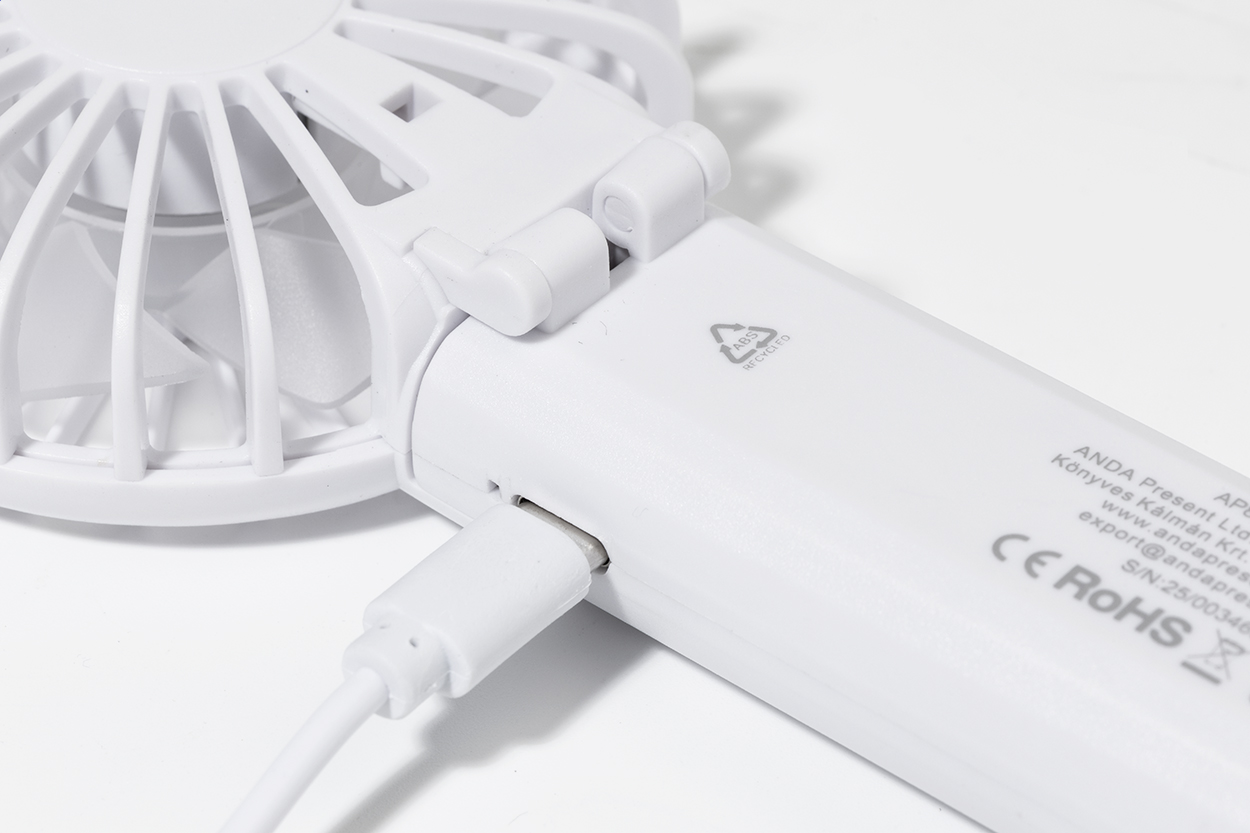 Elektrický ruční větráček z recyklovaného ABS plastu s vestavěnou dobíjecí baterií přes USB (400 mAh). S nastavitelným úhlem hlavy a 3 rychlostmi. Včetně USB kabelu pro nabíjení.
