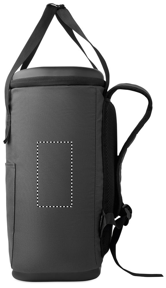 Chladicí batoh z voděodolného materiálu 600D RPET s izolací z pěnového PE a podšívkou PEVA. Má tvarované víko, polstrovaná síťovaná záda, přední kapsu na zip a boční síťované kapsy. Objem 20 l.