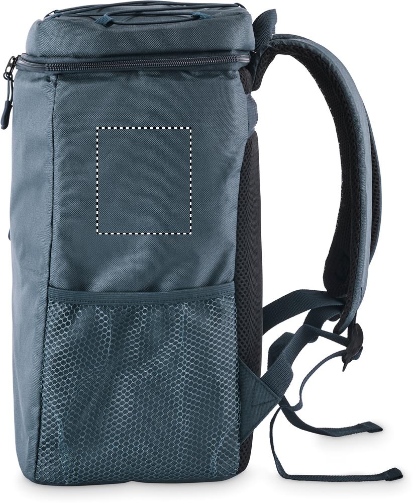 Chladicí batoh z polyesteru 600D RPET s polstrovanými nastavitelnými ramenními popruhy, podšívkou PEVA a 5 mm PE pěnou. Přední kapsa a dvě boční síťované kapsy. Objem: 9 l.