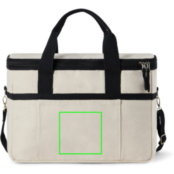 Prostorný chladicí koš v elegantní kombinaci přírodní bílé a černé barvy udrží potraviny i nápoje v optimální teplotě během výletů. Pevné recyklované plátno s vysokou gramáží zajišťuje dlouhou životnost a odolnost při častém používání.