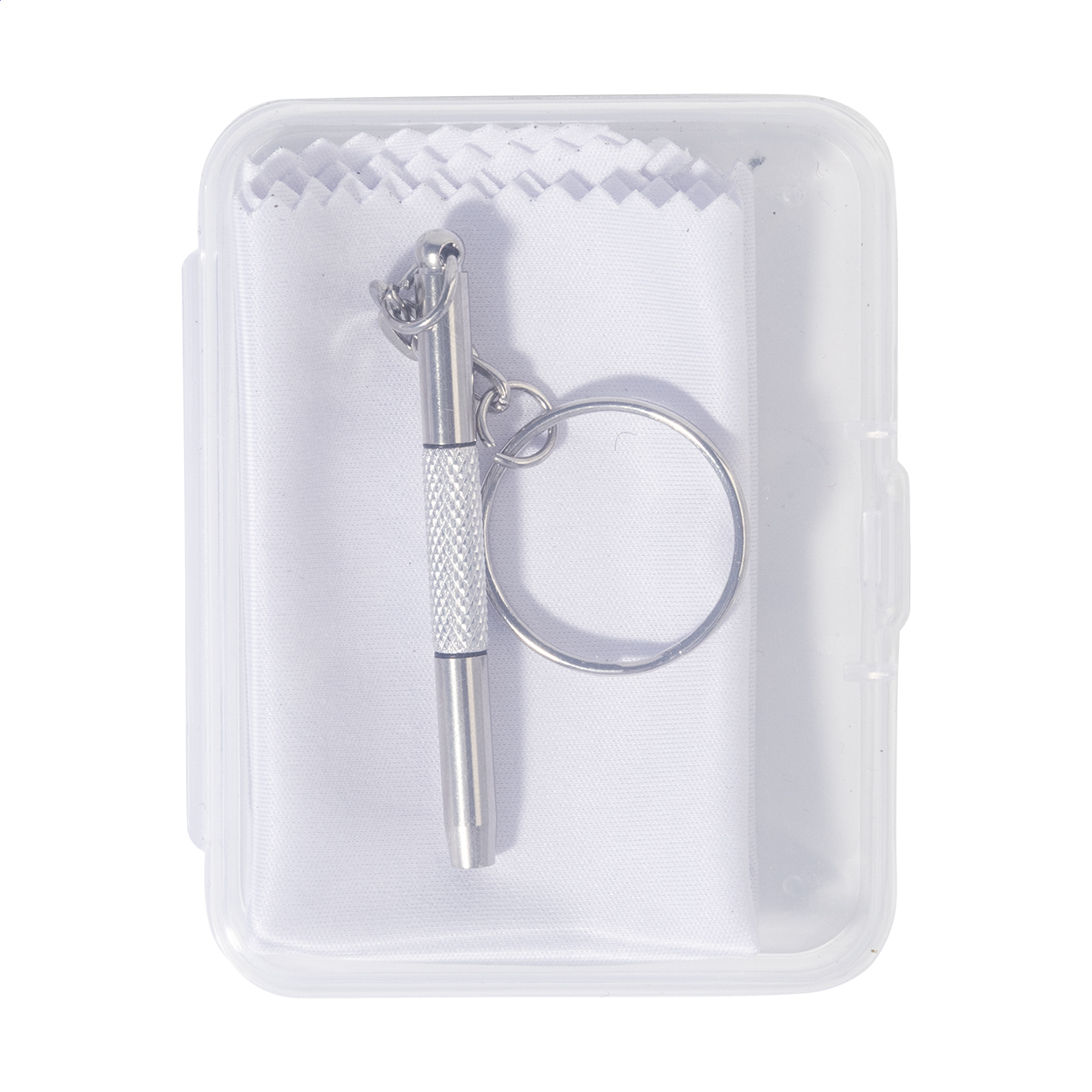 Kompaktní sada na opravu brýlí v průhledné PP krabičce. Včetně čisticího hadříku ze 100% RPET mikrovlákna (220 g/m²) a mini šroubováku s klíčenkou. Rozměr hadříku: 18×15 cm.