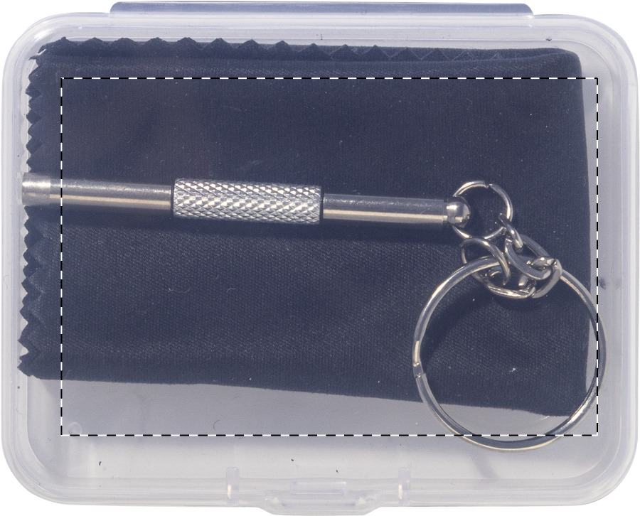 Kompaktní sada na opravu brýlí v průhledné PP krabičce. Včetně čisticího hadříku ze 100% RPET mikrovlákna (220 g/m²) a mini šroubováku s klíčenkou. Rozměr hadříku: 18×15 cm.