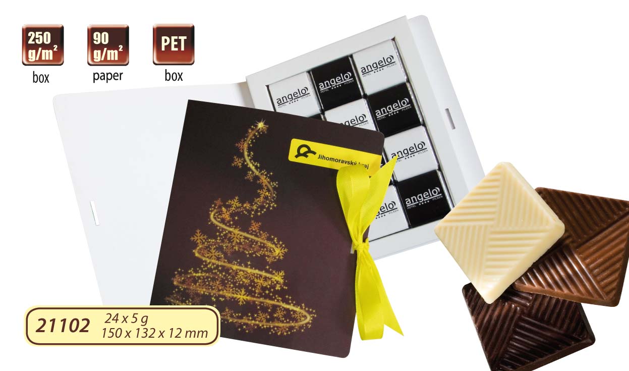 Papírová čokoládová kniha s belgickými mléčnými čokoládami (min. 33 % kakaa). Trvanlivost min. 12 měsíců. Stříbrná hliníková folie, křídový lesklý papír, lepenka 250 g/m2, lamino lesk, PET víčko na čokolády, stuha. Velikost 150x132x12 mm. Plnobarevný potisk na přebaly čokolád každý s vlastním potiskem a vnější stranu desek v ceně produktu.