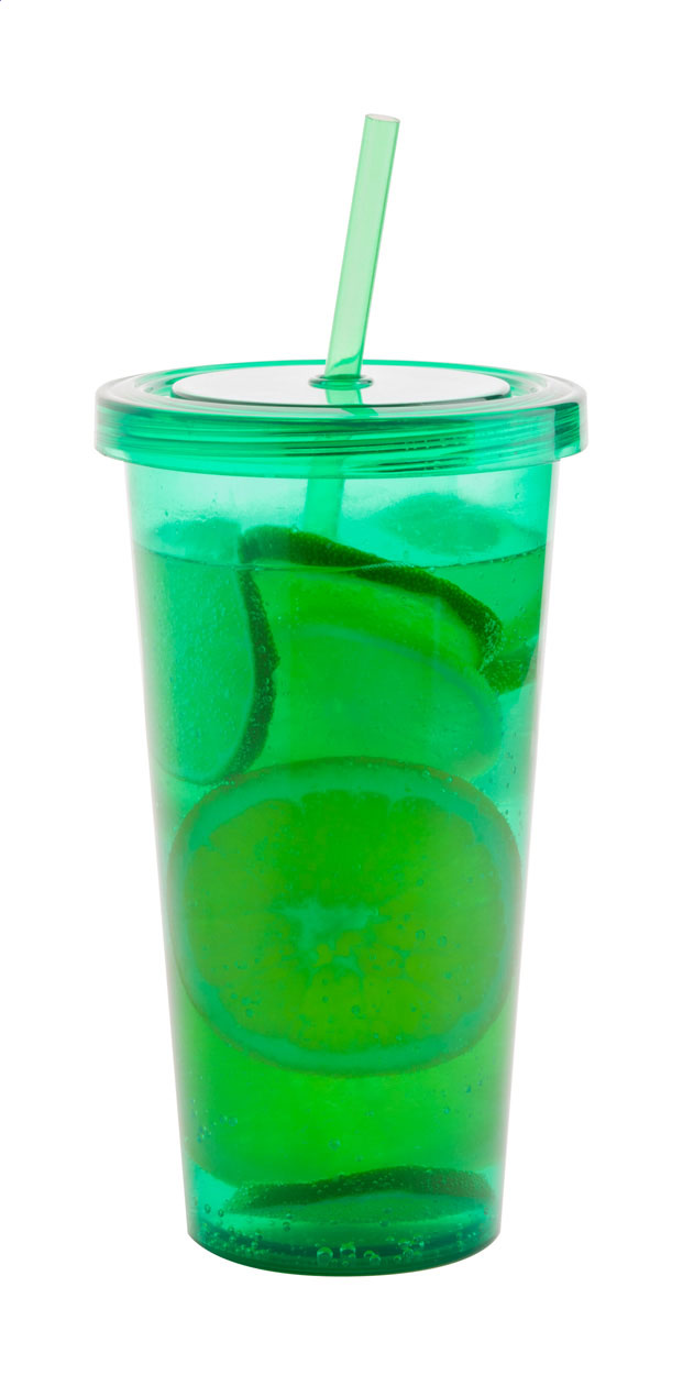 Barevný plastový kelímek s víčkem a brčkem. Objem 750 ml.