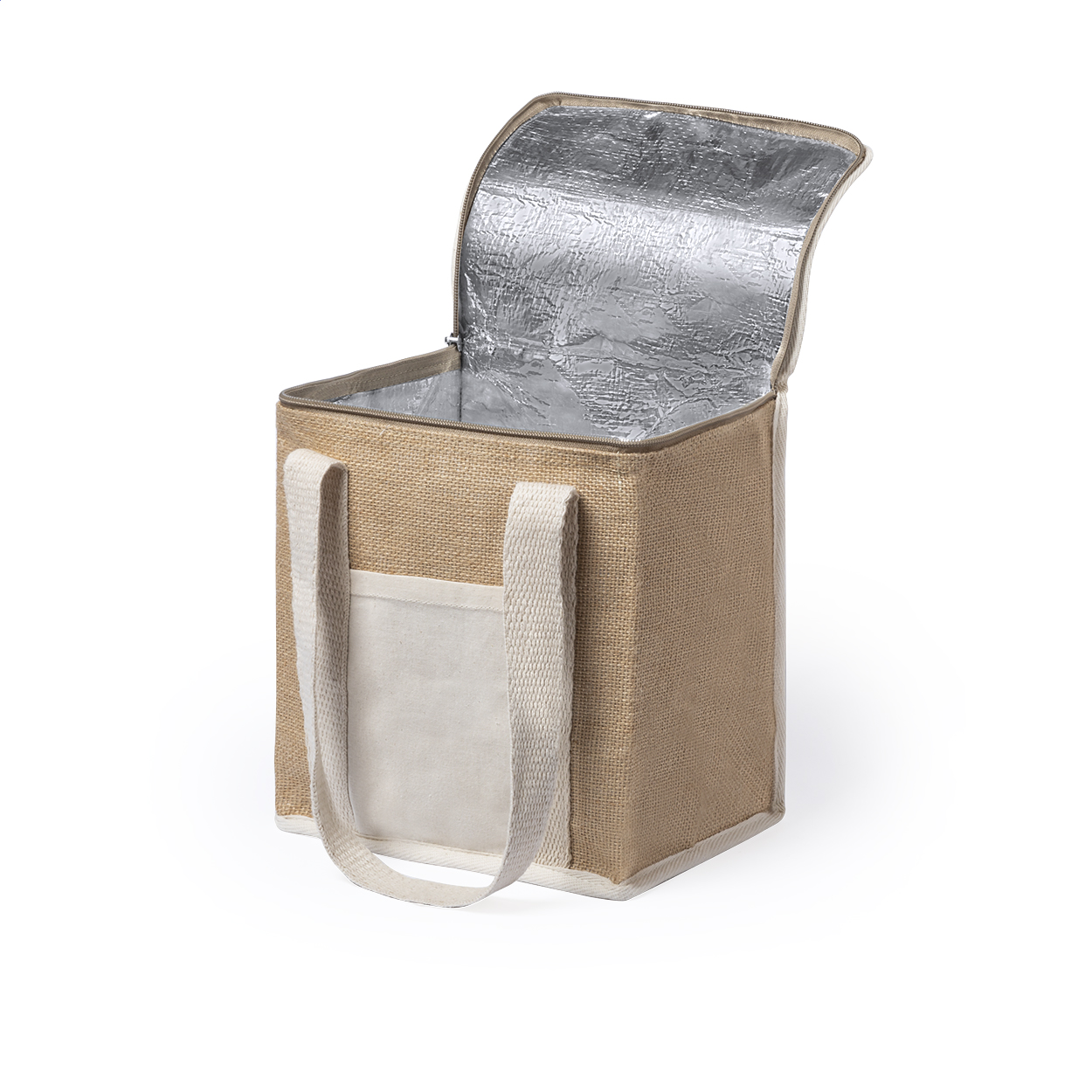 Chladící taška na zip z laminované juty a bavlny s hliníkovou výplní. S přední kapsou z bavlny, ideální pro potisk.